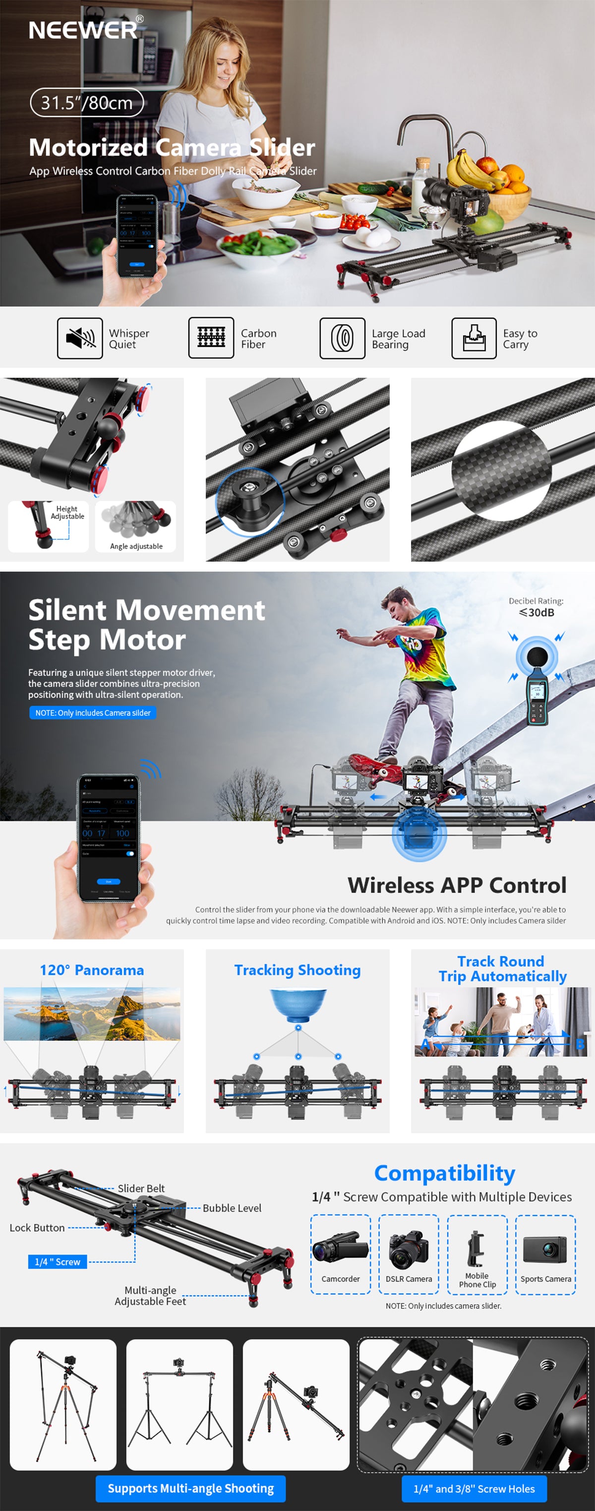 - 【Curseur de caméra polyvalent et lisse】 Ce curseur de caméra à distance de 31,5 "/ 80 cm de long déplace automatiquement votre caméra d'avant en arrière pour une prise de vue vidéo professionnelle. La capacité de charge maximale est de 11 lb/5 kg lorsqu'il est placé horizontalement et de 5,5 lb/2,5 kg lorsqu'il est incliné à 45 °