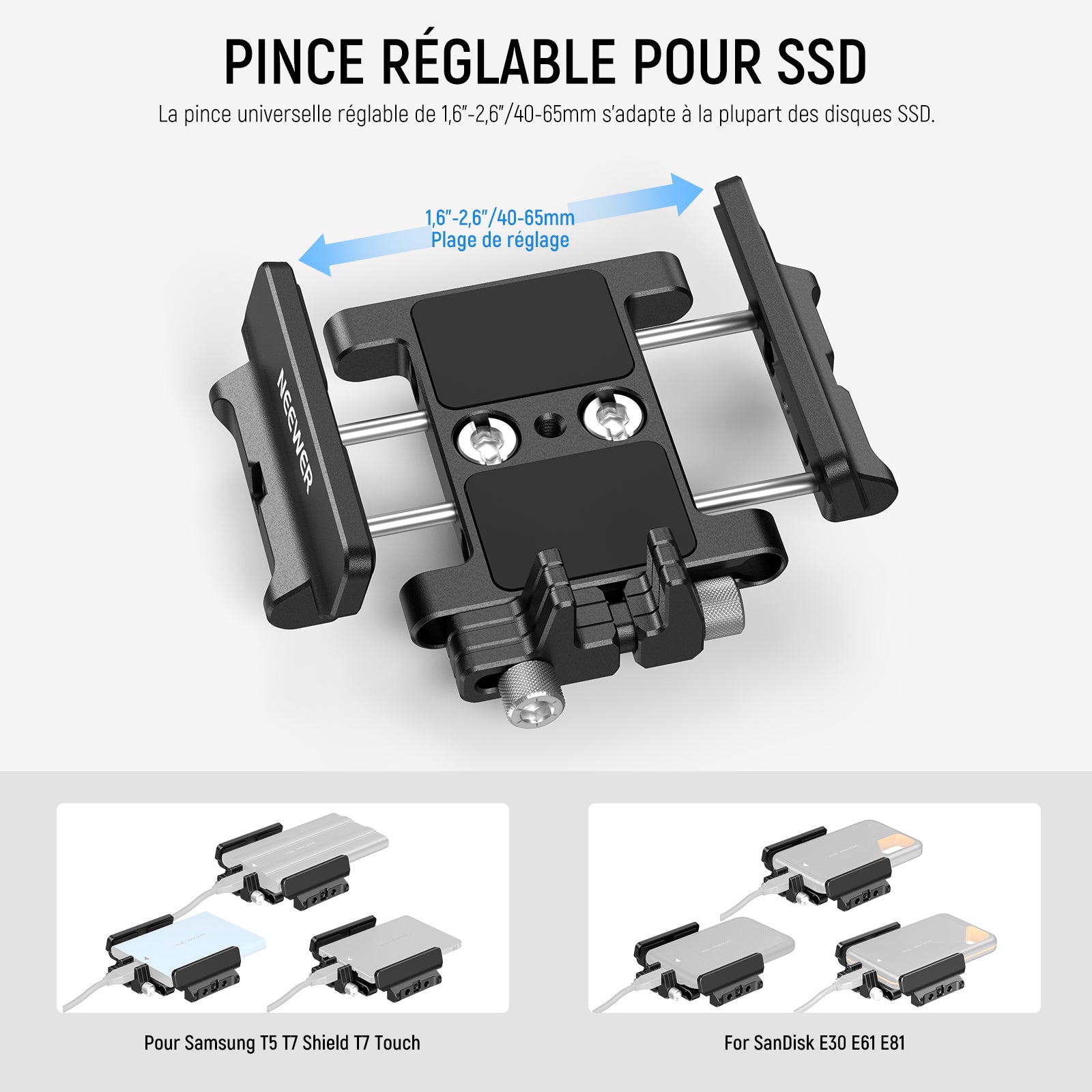 - 【Support de support universel pour SSD】ce support de serrage réglable à ressort de 40 à 65 mm est compatible avec Samsung SSD T5/T7/T7 Shield, compatible avec San Disk Extreme Pro 1 To 2 To SSD E30/E61/E81. compatible avec G-Technology G-DRIVE Mobile SSD, compatible avec Glyph Atom SSD, compatible avec Angelbird SSD2go PKT et autres disques durs SSD grand public