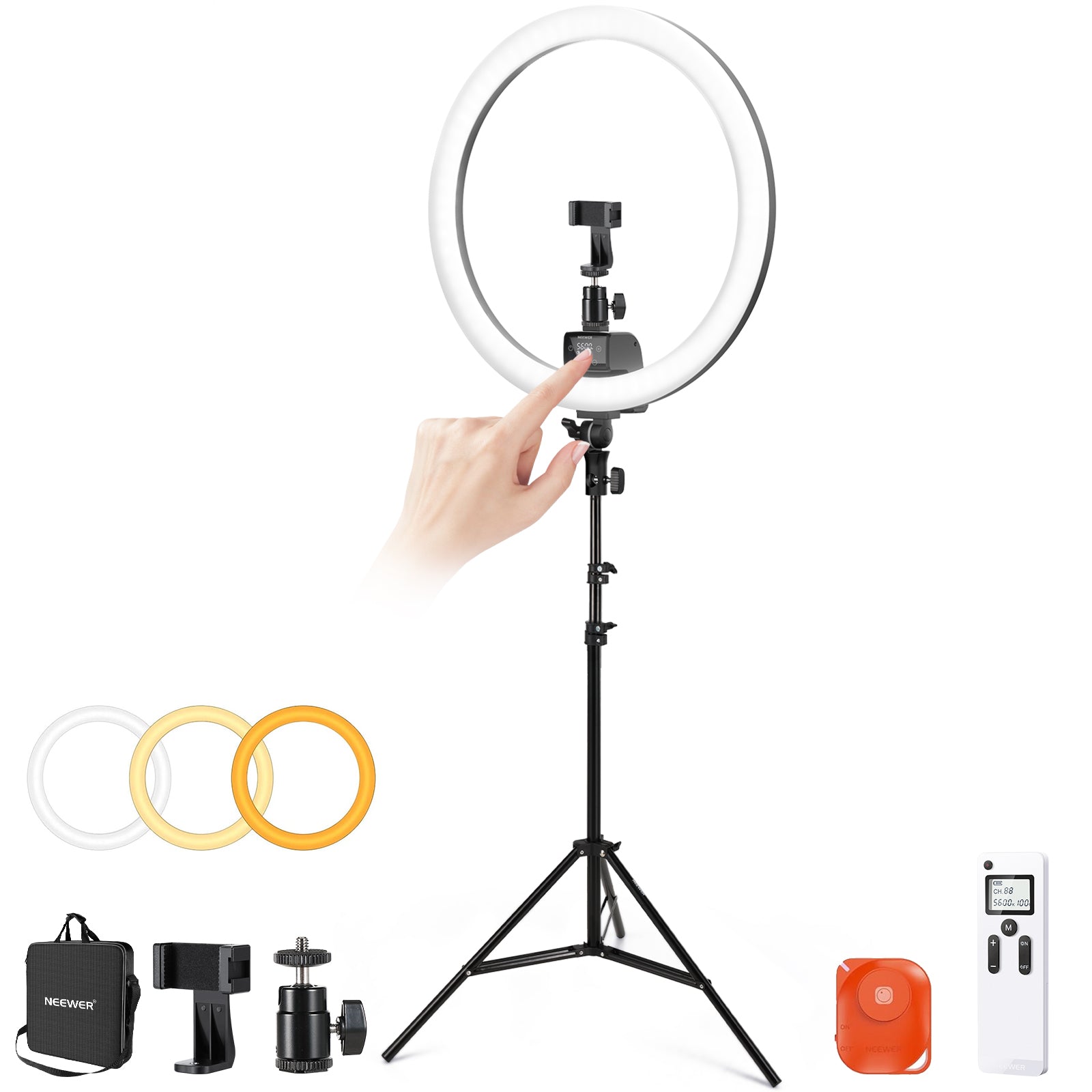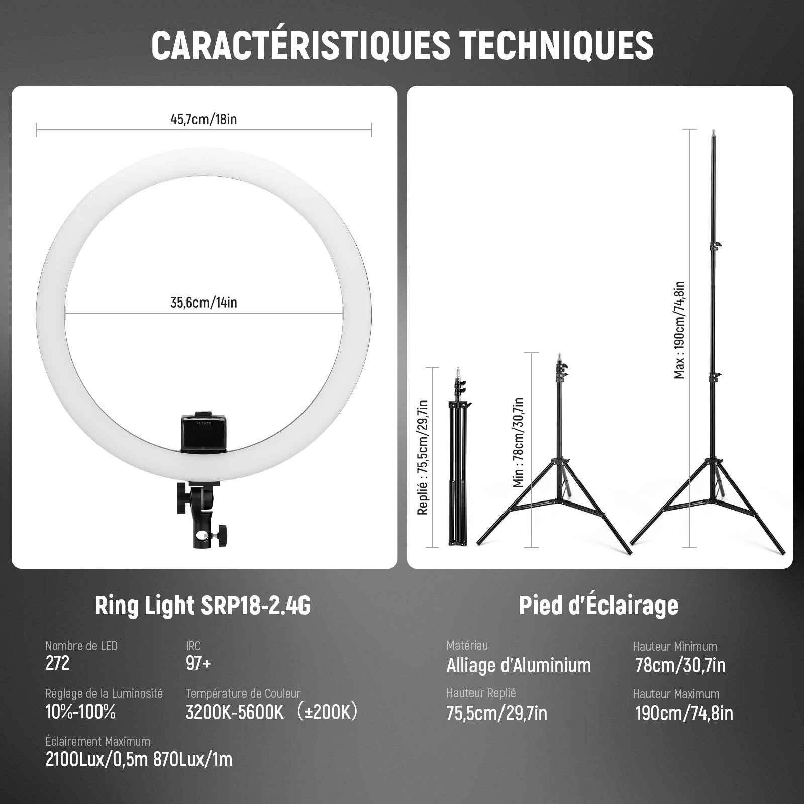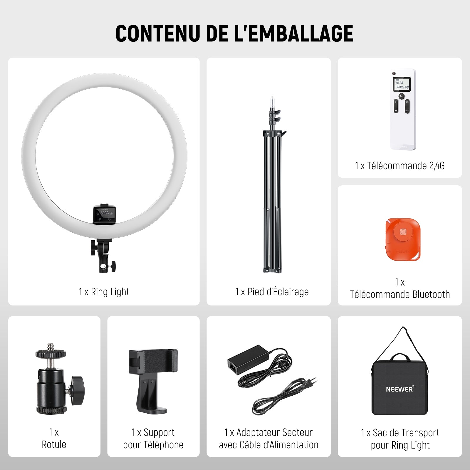 - PACKAGE COMPREND- (1) une lampe annulaire à LED de 18 pouces, (1) un support de lampe, (1) une télécommande 2,4G, (1) une télécommande Bluetooth, (1) un adaptateur pour sabot de connexion, (1) un adaptateur secteur universel avec prise EU, ( 1) Pince pour téléphone intelligent, (1) sac de transport pour lampe annulaire; Remarque: l'appareil photo et le téléphone ne sont pas inclus; le sac ne peut contenir que la lampe annulaire