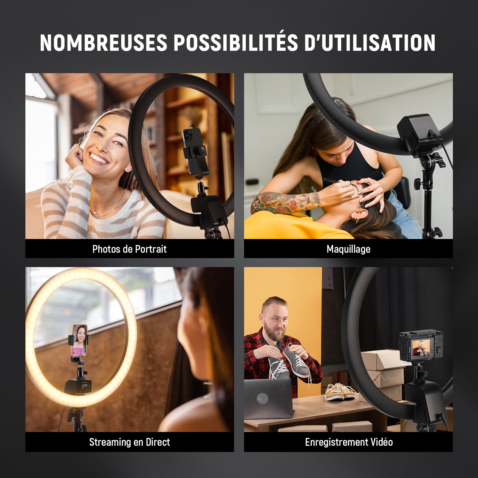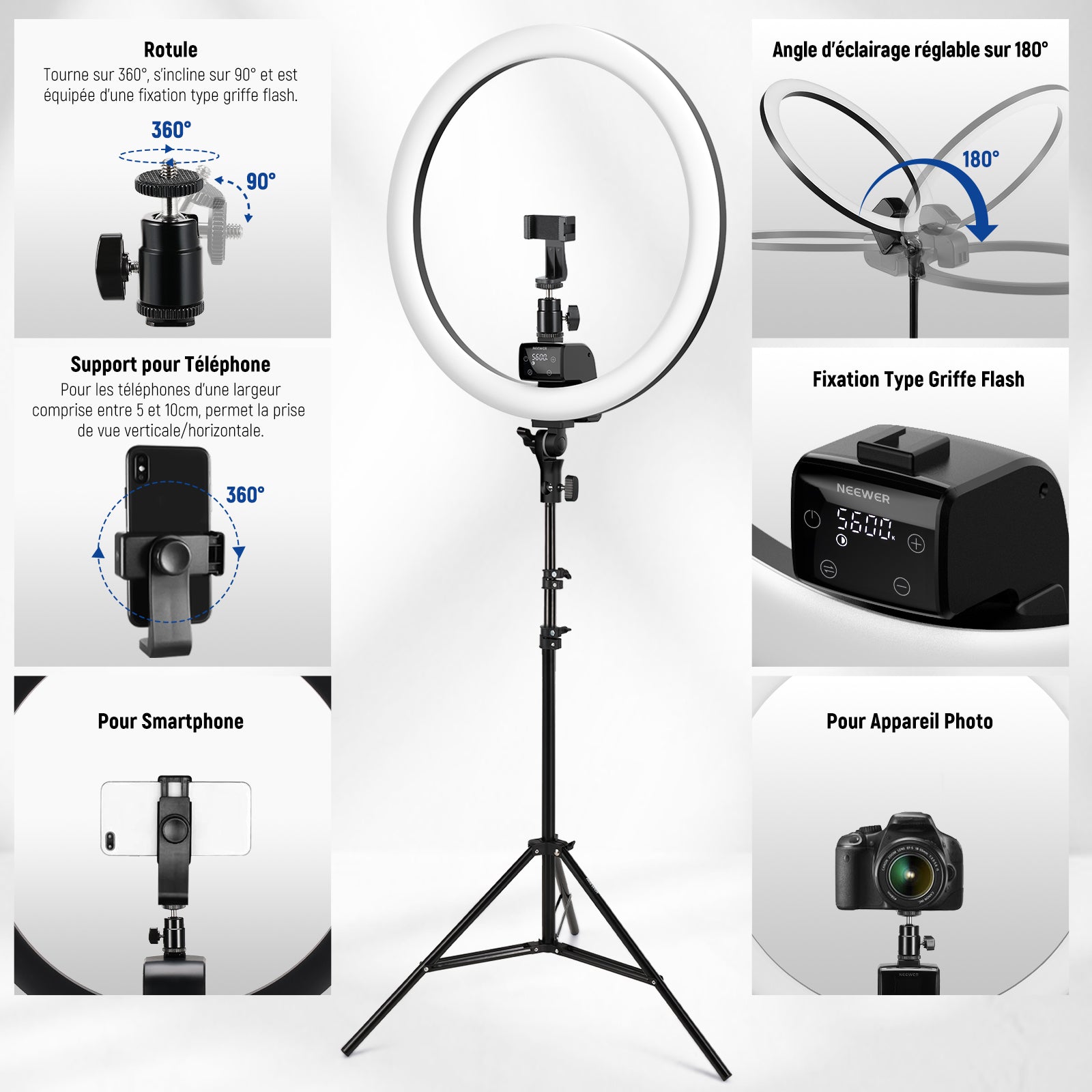 - SUPPORT POUR SMARTPHONE ET SUPPORT DE LUMIÈRE INCLUS- Un adaptateur pour sabot à rotule est compatible avec la plupart des appareils photo reflex numériques et un support pour téléphone intelligent pour la plupart des smartphones; parfait pour le maquillage, l'éclairage de selfie, la photographie en mode portrait, les flux en direct, les blogs, les salons de coiffure , etc.