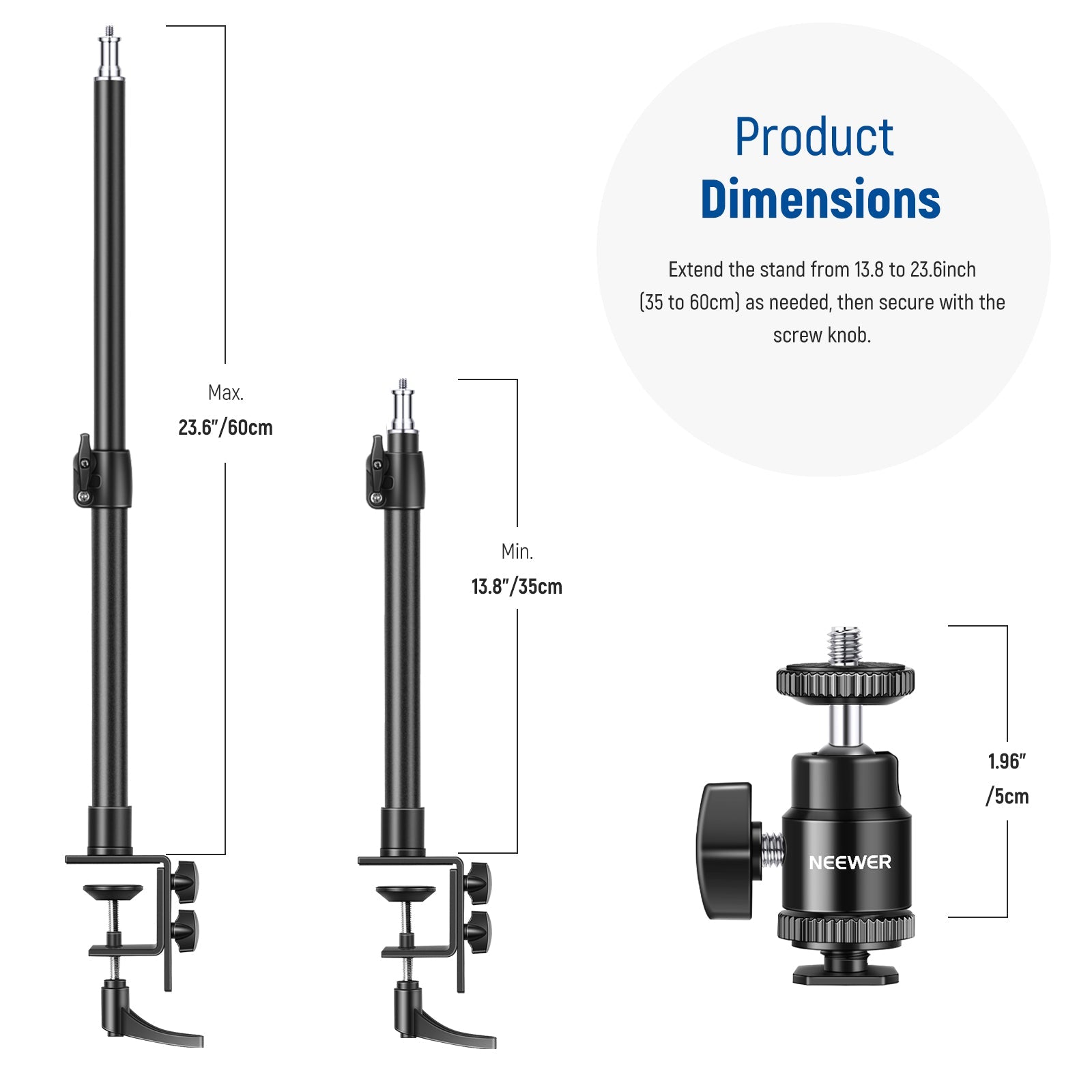 - 【Contenu de l'emballage】 Deux supports de table Neewer avec pinces en C, deux mini têtes sphériques, deux adaptateurs de sabot.