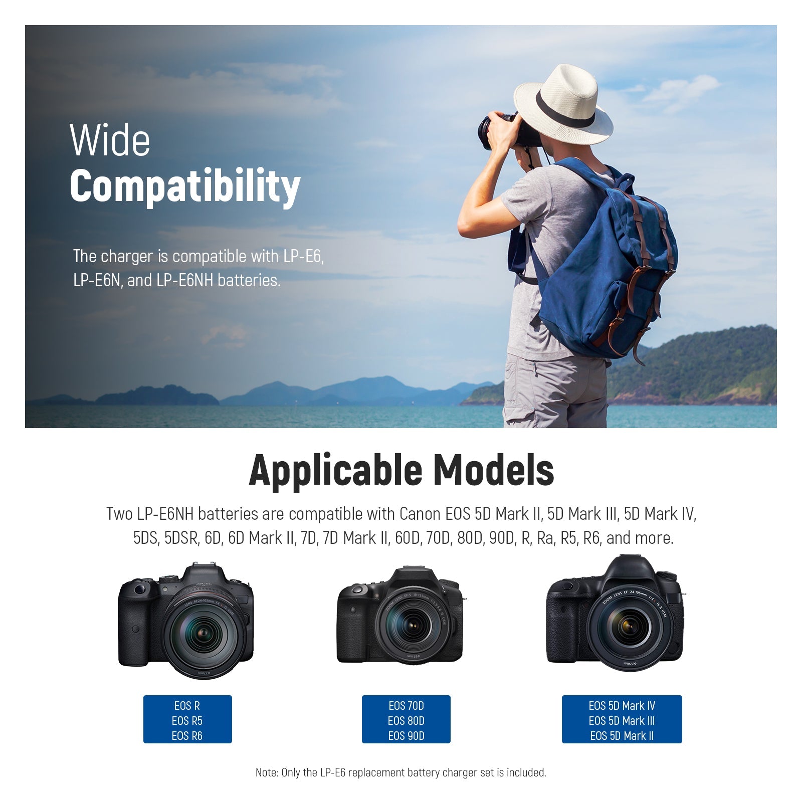 - 【Grande compatibilité】 Deux batteries LP-E6NH sont compatibles avec Canon EOS 5D Mark II, 5D Mark III, 5D Mark IV, 5DS, 5DSR, 6D, 6D Mark II, 7D, 7D Mark II, 60D, 70D, 80D, 90D, R, Ra, R5, R6, R7 et plus. Le chargeur est compatible avec les batteries LP-E6, LP-E6N et LP-E6NH