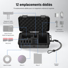 - 12 emplacements dédiés : 12 emplacements pour garder tout bien rangé et organisé. 1 emplacement pour appareil photo Action 5 Pro/4/3, 1 emplacement pour adaptateur à dégagement rapide, 2 emplacements pour cartes micro SD, 3 emplacements pour les batteries, 1 emplacement pour l'objectif d'origine, 3 emplacements pour les filtres, 1 emplacement pour petits accessoires (câbles, adaptateurs de caméra d'action, lumières de remplissage, etc.). Compatible avec les accessoires DJI Osmo Action 5 Pro Adventure Combo