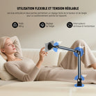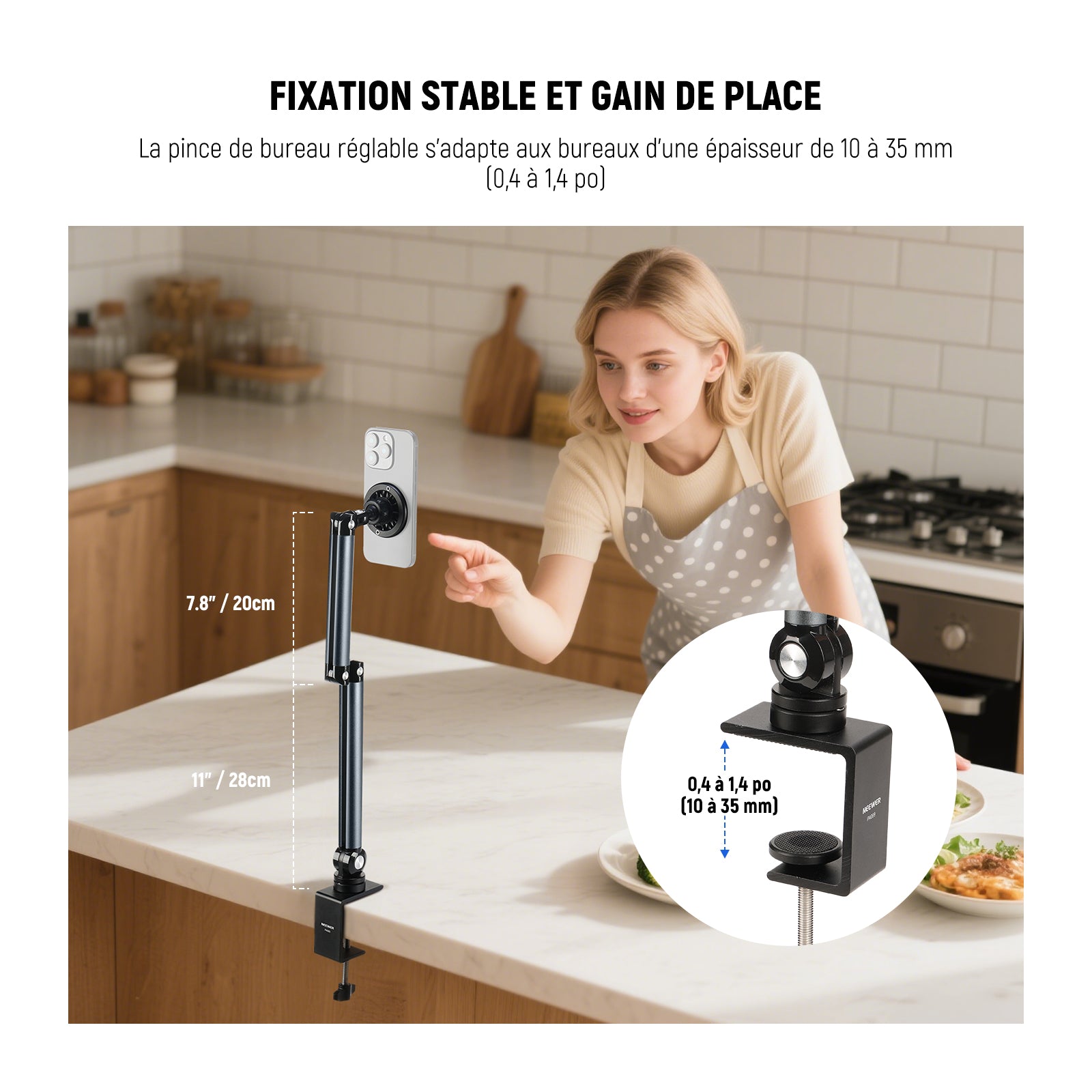 - Utilisation flexible et tension réglable : les bras articulés à deux sections permettent un réglage facile de la hauteur et de l'angle pour un positionnement optimal de l'appareil. Une clé en forme de L incluse vous permet de personnaliser la tension des articulations pour plus de stabilité et de facilité d'utilisation. En outre, le support de téléphone permet des commutateurs d'orientation horizontale et paysage pour différents besoins de prise de vue