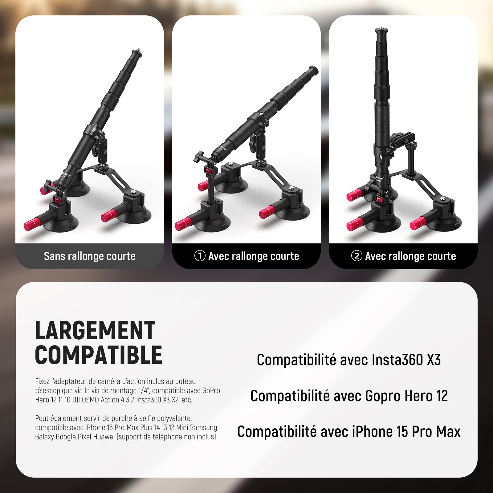 • 【Kit de support voiture à triple ventouse】Capturez des vidéos immersives en vue subjective (POV) depuis des angles de conduite uniques comme le capot, le pare-brise (intérieur/extérieur), le tableau de bord ou le côté de votre voiture. Ce support à ventouse pour caméra s’attache solidement à l’aide de trois puissantes ventouses, et permet un positionnement flexible grâce aux rallonges et au bras magique à rotule, avec une dragonne de sécurité pour une protection supplémentaire. Remarque : À utiliser à des vitesses inférieures à 80 km/h pour éviter les chutes accidentelles.