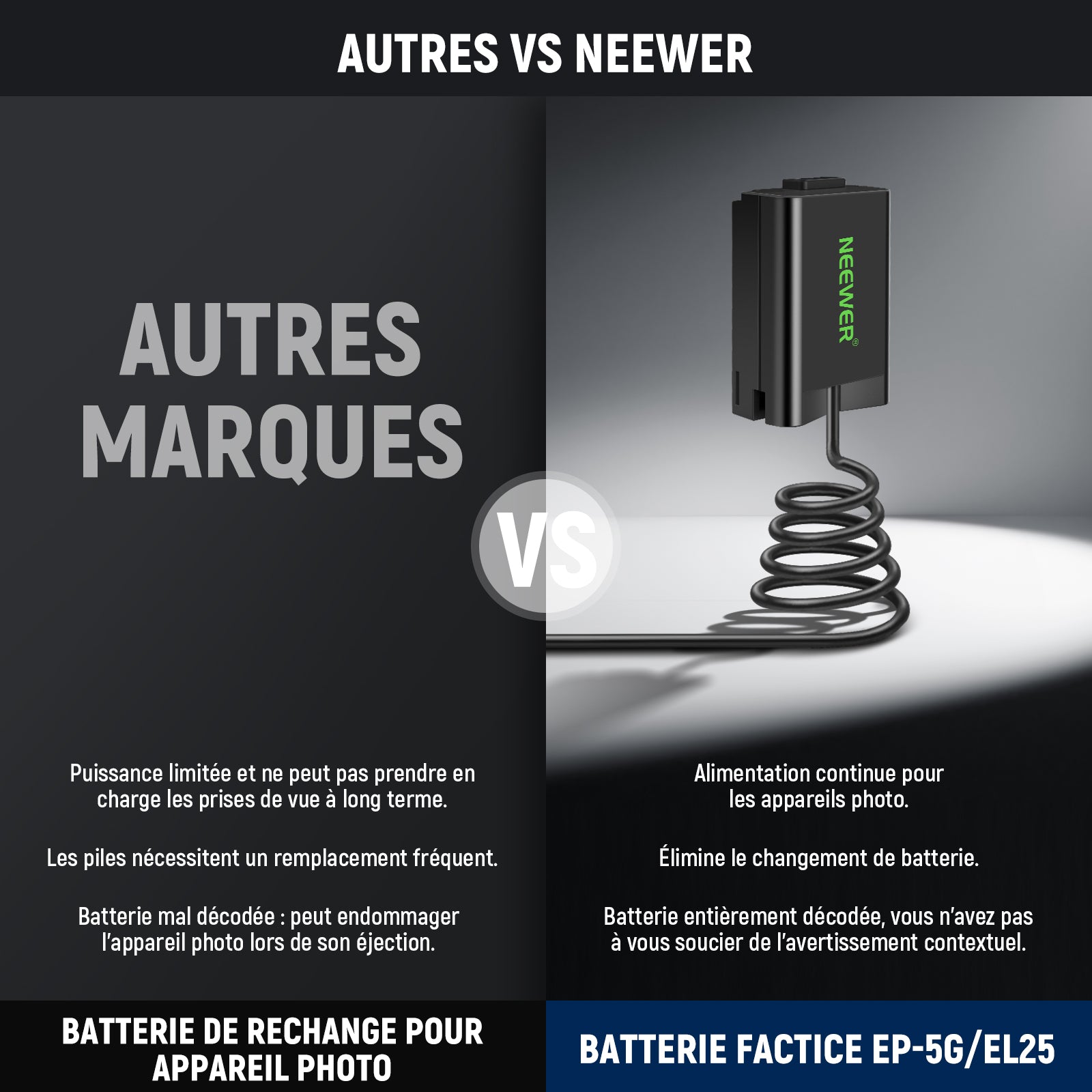 - 【Éliminez l'échange de batterie 】 Plus de remplacement fréquent de la batterie ! Le kit de batterie factice de remplacement NEEWER EP-5G remplace les batteries EN-EL25 Nikon, assurant une alimentation continue à votre appareil photo pour vous permettre de prendre des photos pendant de longues périodes sans interruption ni besoin de batteries de rechange