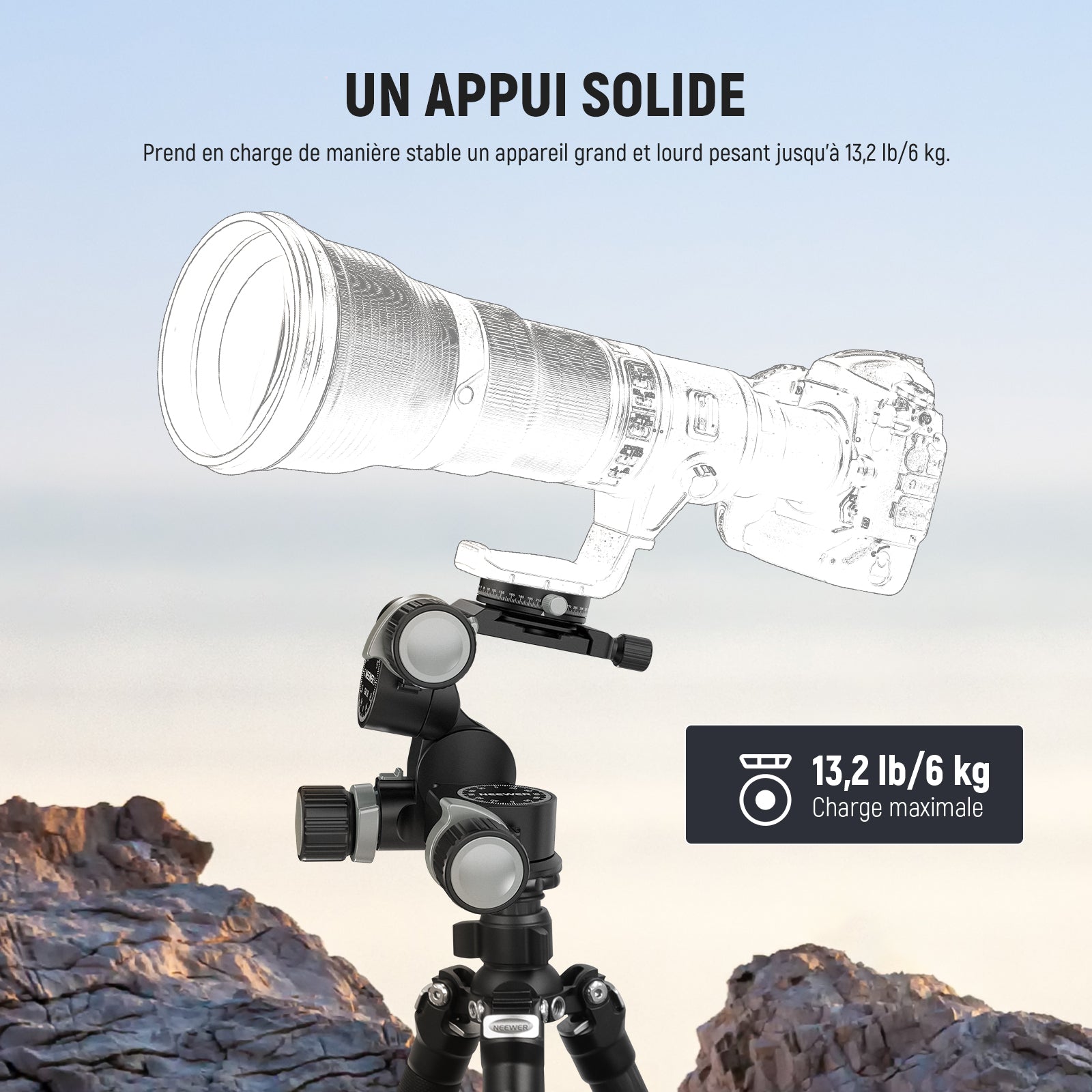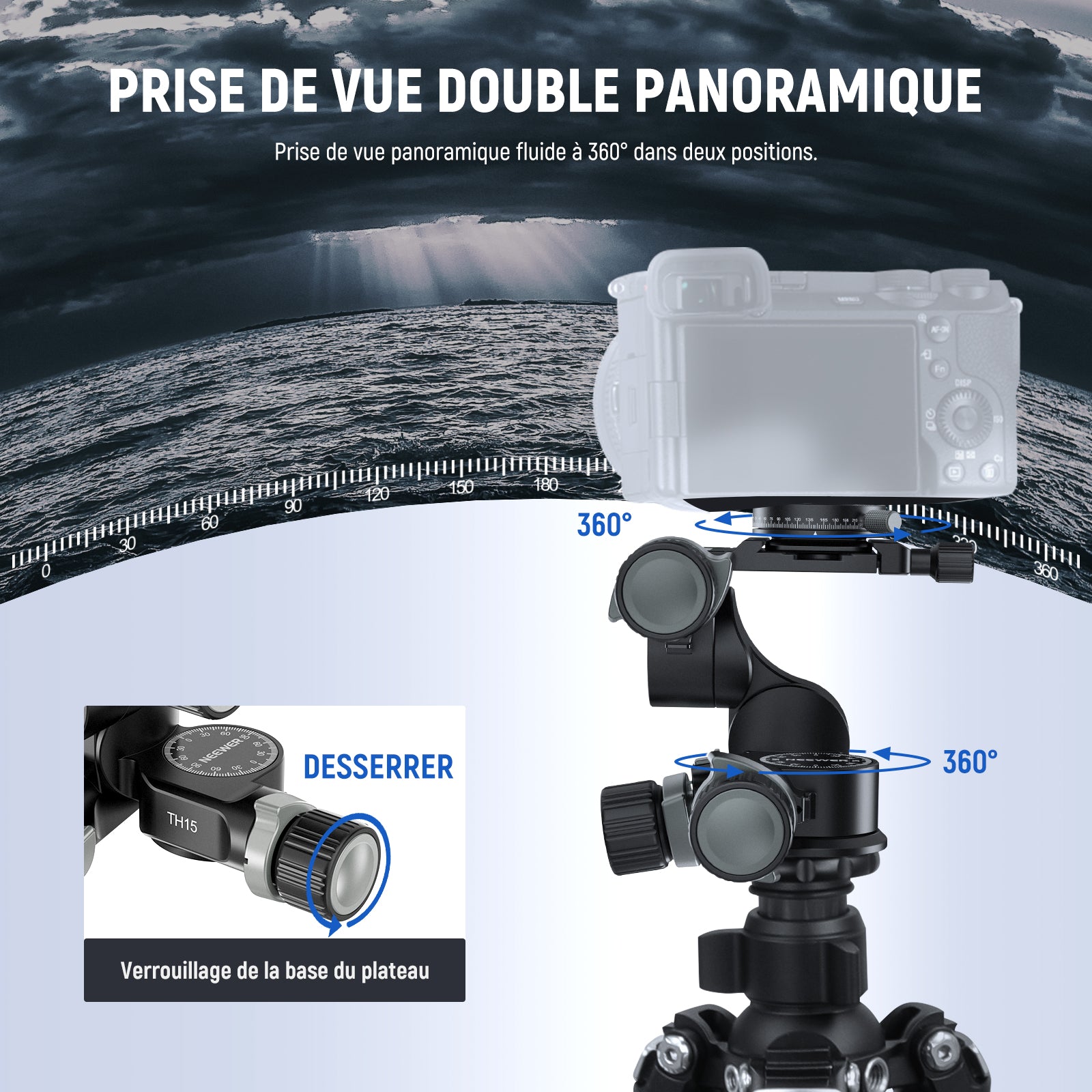 - Atteignez des angles de caméra flexibles - En manipulant la tête orientable, vous pouvez atteindre divers angles de caméra pour la photographie panoramique, la photographie à bas angle, la photographie en plongée, ou filmer en orientation verticale (portrait) ou horizontale (paysage). Idéal pour la macrophotographie, la photographie de produit, la photographie de paysage, le travail en studio, la photographie panoramique, les relevés architecturaux et l'enregistrement vidéo.