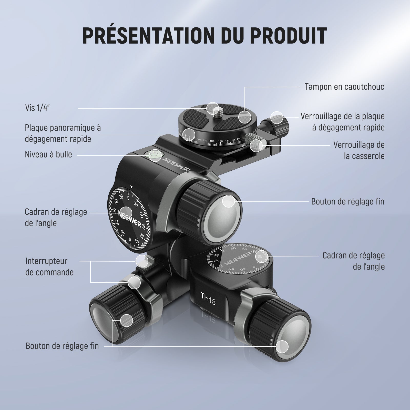 - Tête de trépied orientable 3 axes pour un positionnement efficace - La tête orientable 3 voies NEEWER TH15 offre 3 positions individuelles : inclinaison frontale de -45° à -90°, inclinaison latérale de -90° à 90° et panoramique à 360°. Elle est dotée d'un contrôle de friction d'amortissement et d'un contrepoids pour un positionnement de la caméra fluide et confortable. Deux niveaux à bulle vous aident à niveler avec précision et à maintenir toujours l'appareil photo droit.