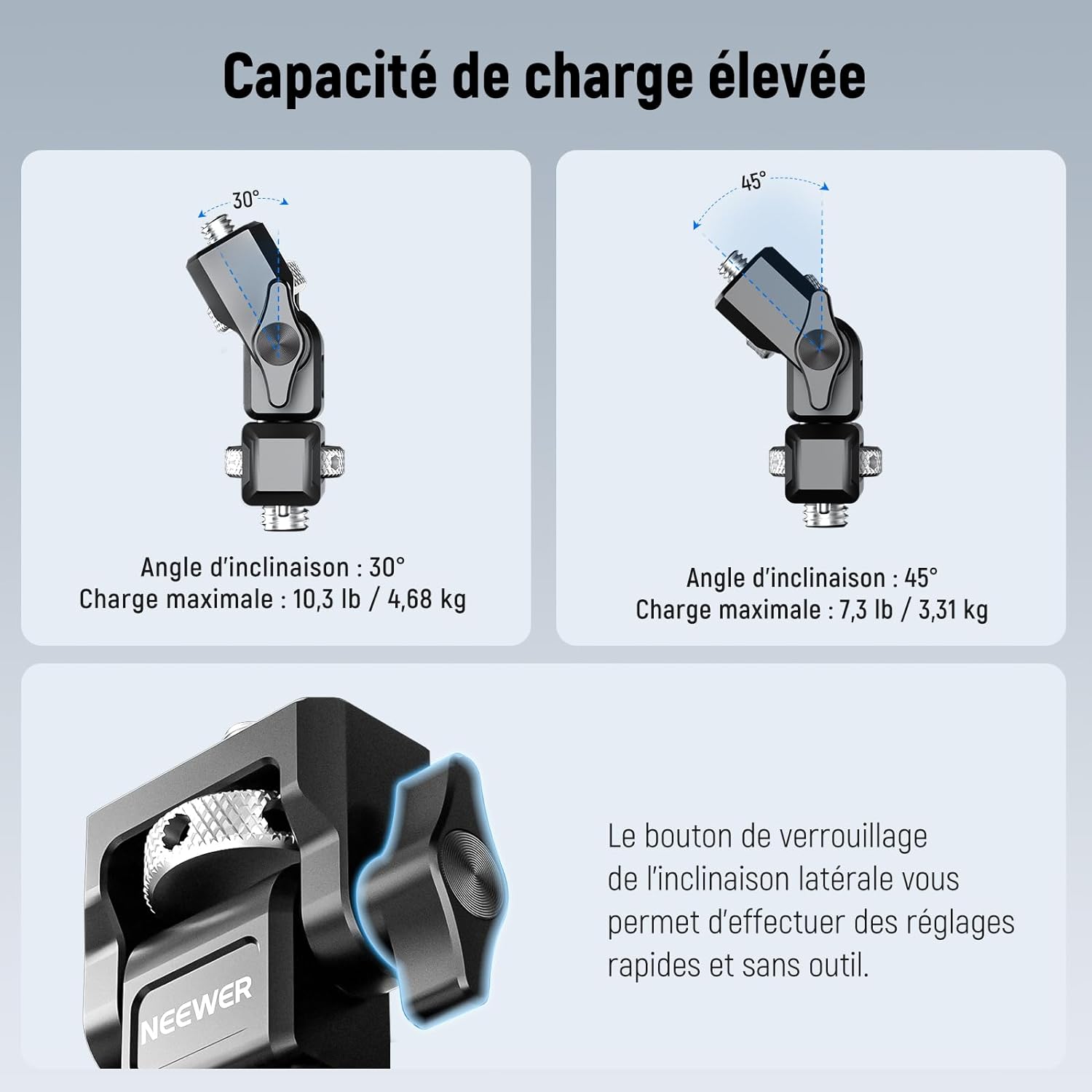 【Capacité de charge plus importante à différents angles】 Bénéficiant d'une plus grande capacité de charge à différents angles, le support de moniteur NEEWER MA004 peut supporter jusqu'à 10,4 lb/4,7 kg à une inclinaison de 30 degrés et 7,3 lb/3,3 kg à une inclinaison de 45 degrés. Que vous travailliez avec de l'équipement lourd ou des angles uniques, ce support peut tout gérer