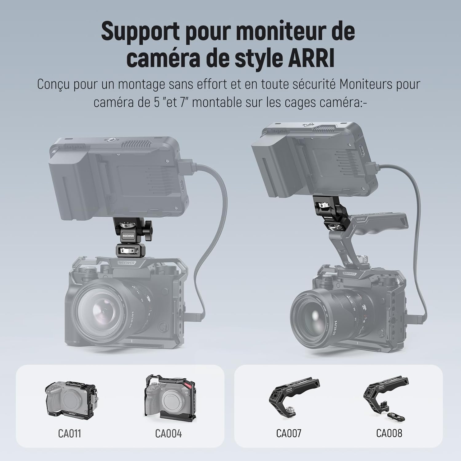 【Support de moniteur de caméra de style ARRI】 Conçu pour monter sans effort et en toute sécurité des moniteurs de caméra 5"~7" sur le dessus de la cage de caméra (comme NEEWER CA011, CA004, CA002). La vis moletée inférieure de 3/8" avec goupilles de positionnement ARRI peut être facilement serrée à la main. Il est parfaitement compatible avec SmallRig cages de caméra, les plates-formes vidéo, la poignée supérieure et d'autres accessoires