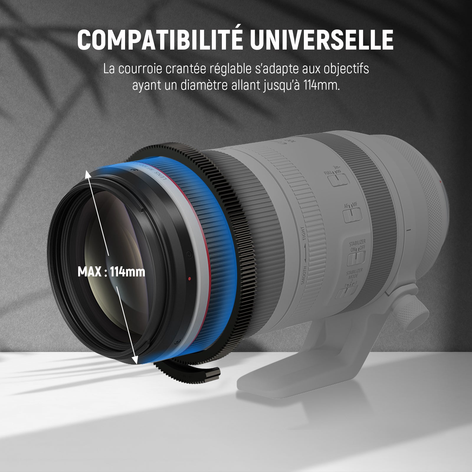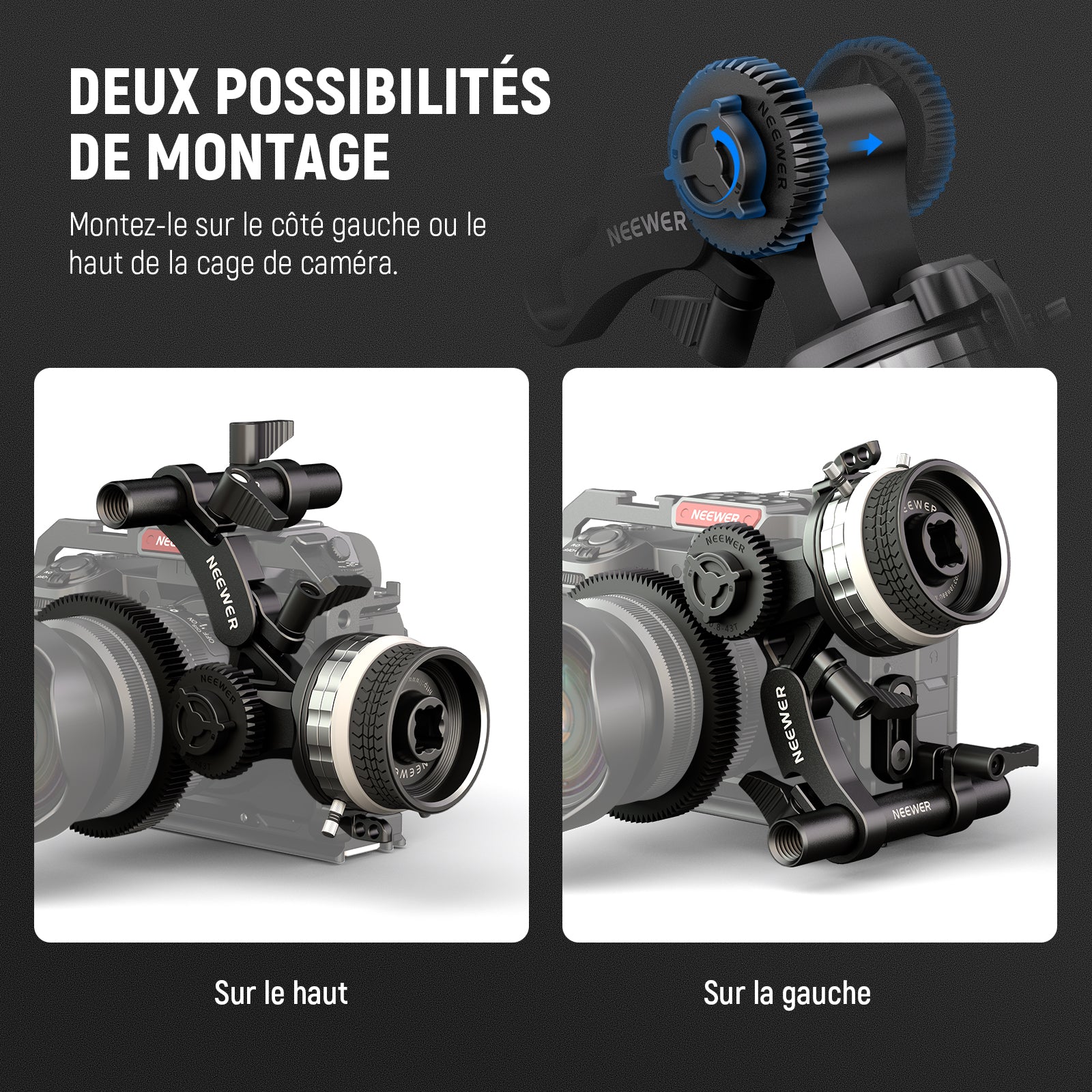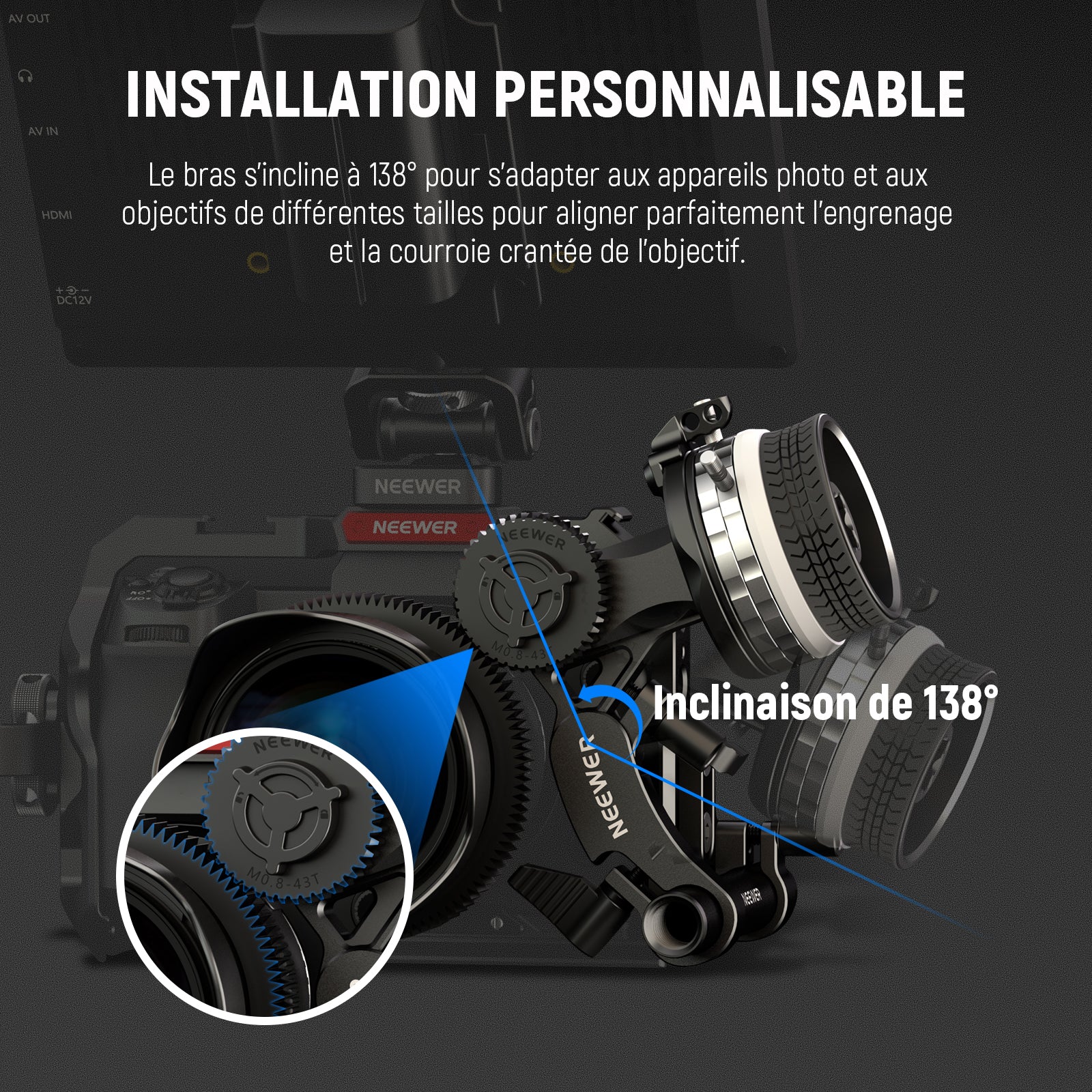 - 【Mise au point manuelle en douceur】 Le Mini Follow Focus PG001 de NEEWER permet une mise au point manuelle fluide pour la réalisation de vidéos. La courroie crantée réglable s'adapte à de nombreux objectifs d'appareils photo jusqu’à un diamètre maximal de 114mm. Pesant seulement 320g, le follow focus peut se glisser dans votre sac et faire le tour du monde avec vous.