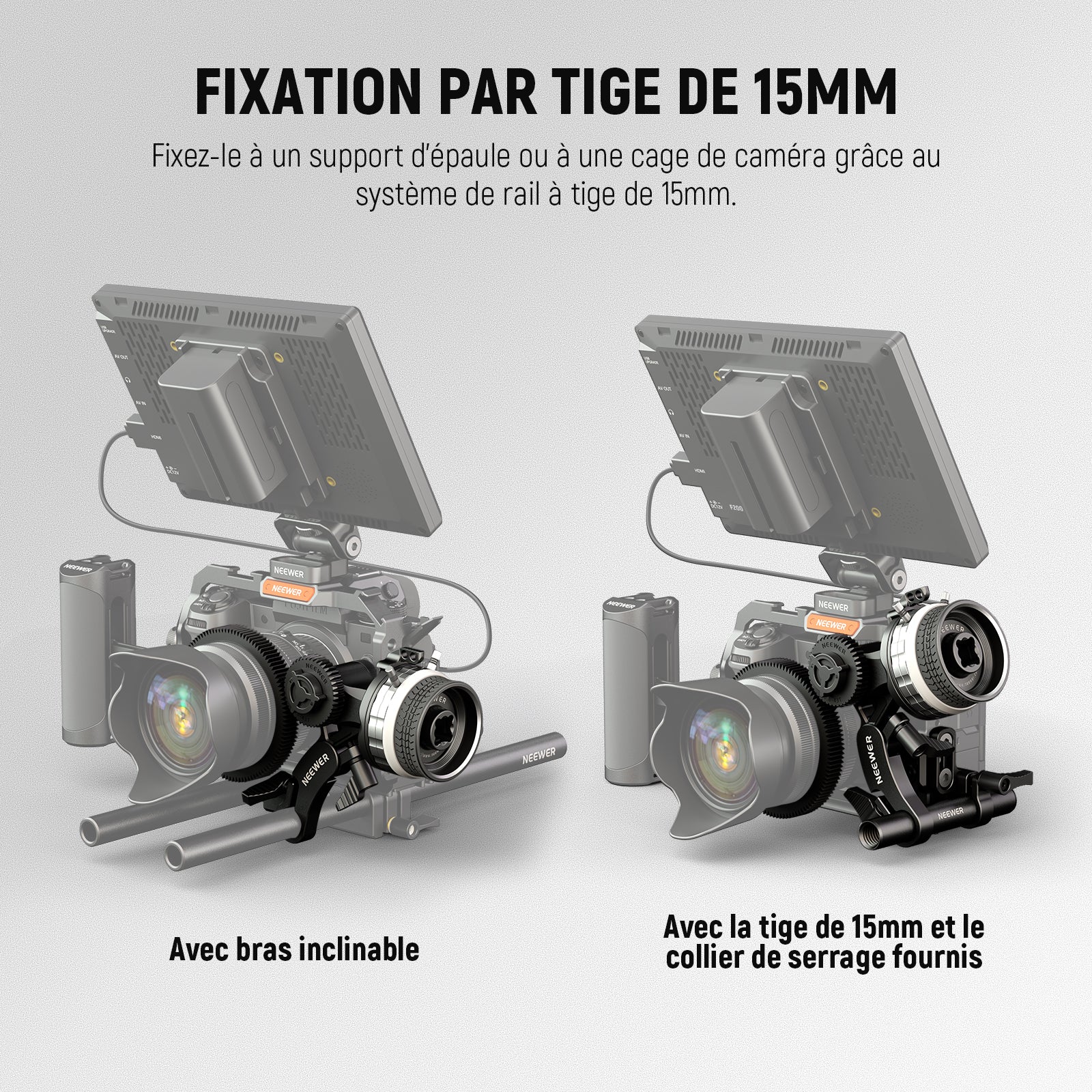 - 【Tige de montage de 15mm】 Une tige standard de 15mm et un collier de serrage sont fournis. Ils permettent de monter le follow focus sur une cage d'appareil photo ou de fixer d'autres accessoires. La construction modulaire facilite le démontage et le rangement du follow focus.