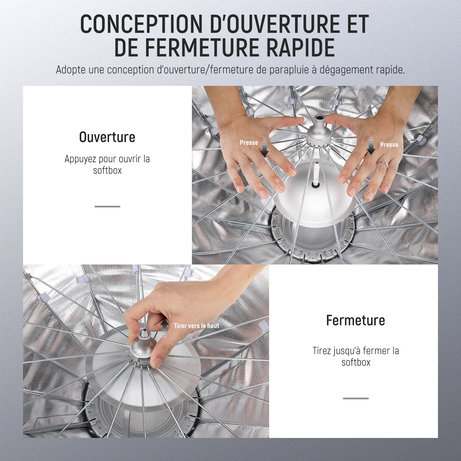 - 【Pliage et pliage rapides comme un parapluie】Adopte un système de verrouillage semblable à un parapluie où vous pouvez ouvrir et fermer sans effort la softbox en tirant ou en poussant simplement, puis la verrouiller automatiquement en place. 16 nervures très résilientes confèrent à cette softbox une durabilité incomparable et une forme parabolique impeccable pouvant résister à des dizaines de milliers de pressions sans déformation