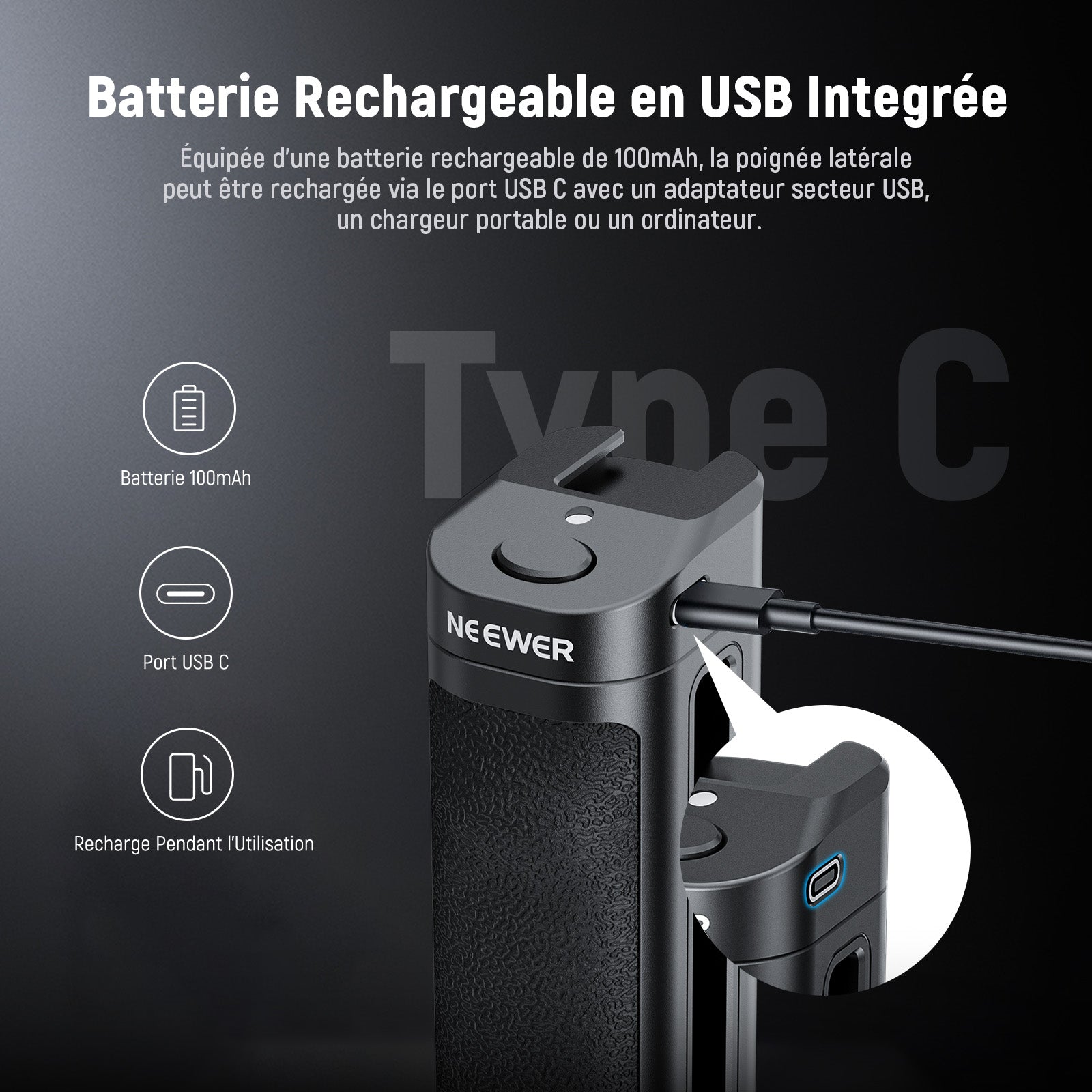 - 【Batterie Intégrée Rechargeable par USB】 En intégrant une batterie rechargeable de 100mAh, la poignée latérale avec déclencheur sans fil Bluetooth peut être rechargée via le port USB C depuis un adaptateur secteur USB, un chargeur portable ou un ordinateur.