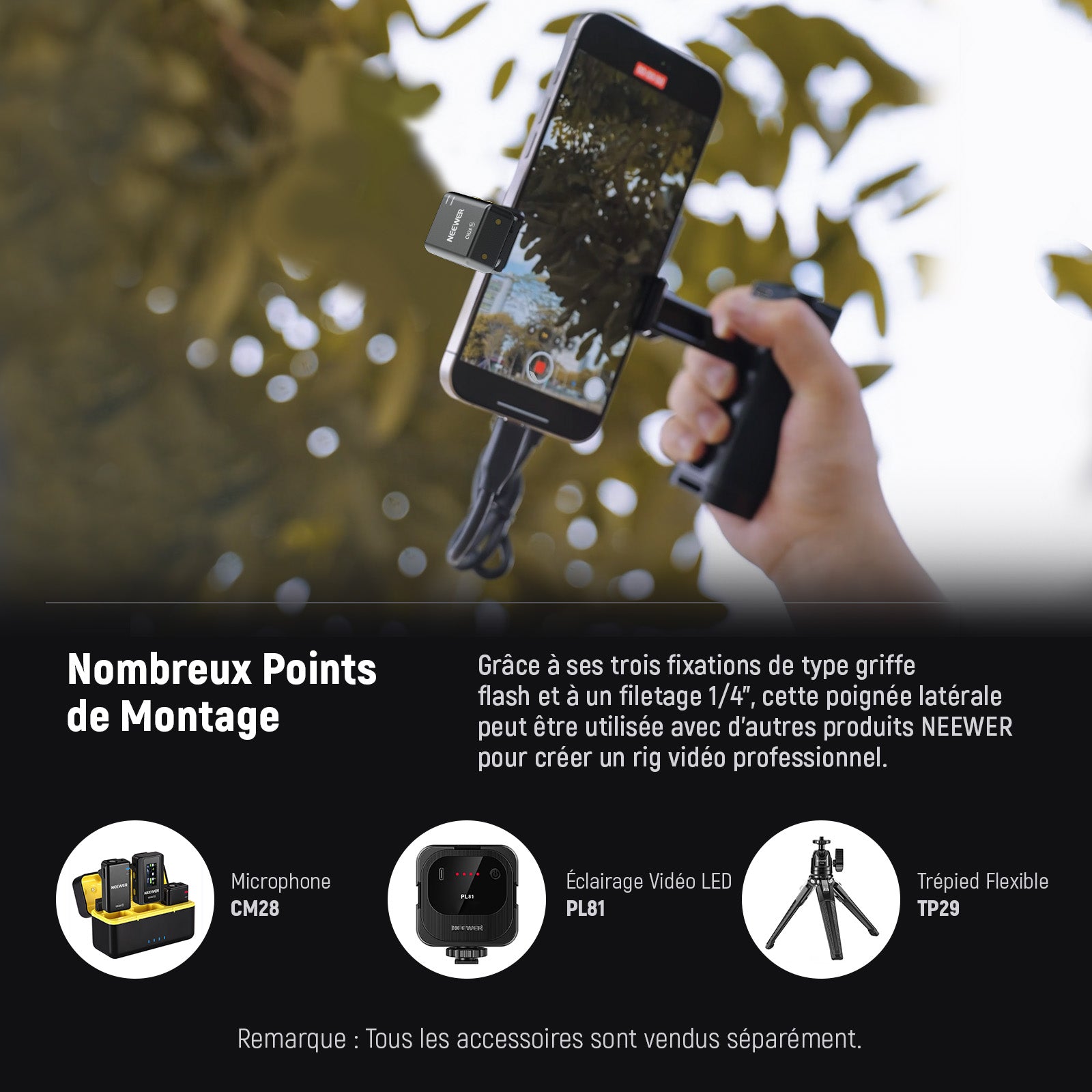 - 【Nombreux Points de Montage d'Accessoires】Avec trois fixations type griffe flash et un filetage 1/4", cette poignée latérale peut être utilisée avec d'autres produits NEEWER pour un rig vidéo professionnel. Cela comprend le Mini Microphone Pro CM14, l'Éclairage Vidéo LED PL81, l'Éclairage Couleur RGB61/RGB62, le Trépied Flexible T30 et plus encore.