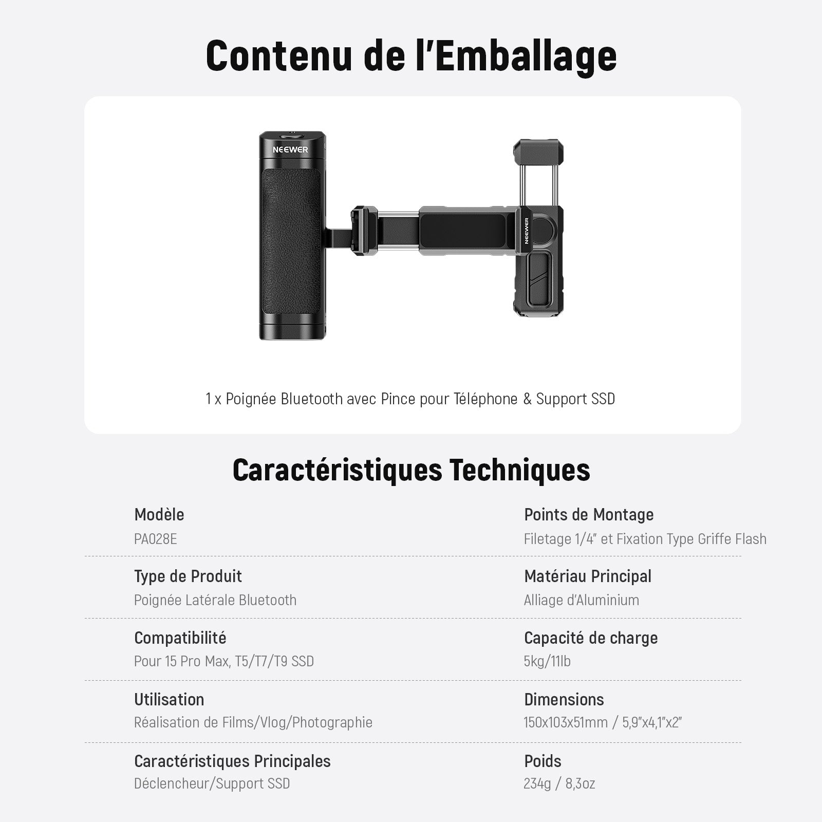 NEEWER PA028E Poignée latérale Bluetooth avec support de téléphone et support SSD pour 15 Pro Max