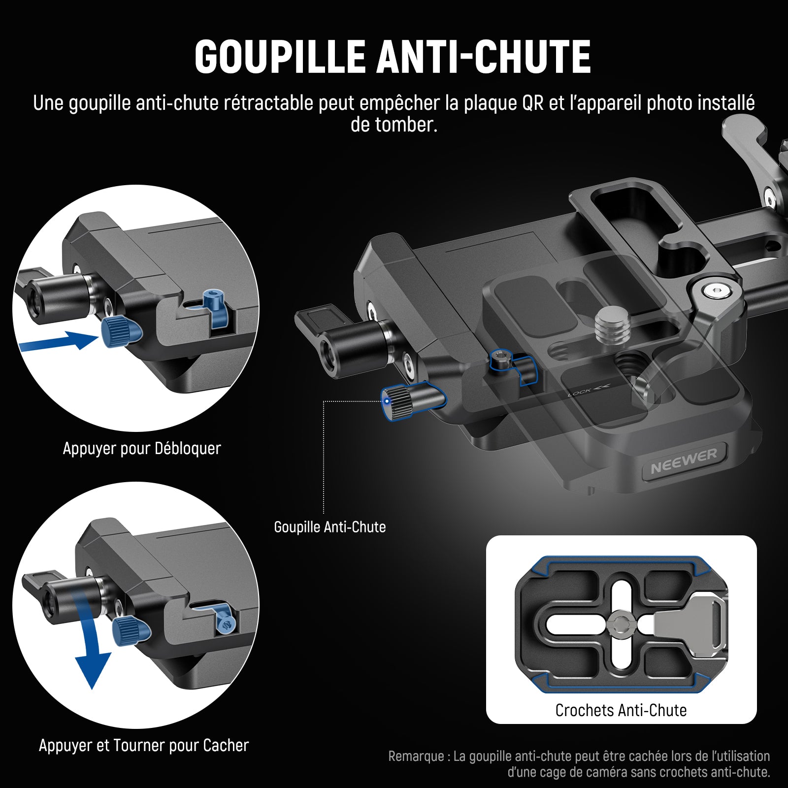 - 【Plaque/Base à Dégagement Rapide de Type Arca】 La plaque de batterie est dotée d'une plaque à dégagement rapide de type Arca pour divers appareils photo et d'une base de type Arca avec des filetages de 1/4" et 3/8" pour la plupart des têtes de trépied. Une broche anti-décrochage rétractable empêche la plaque et l'appareil photo monté de tomber.