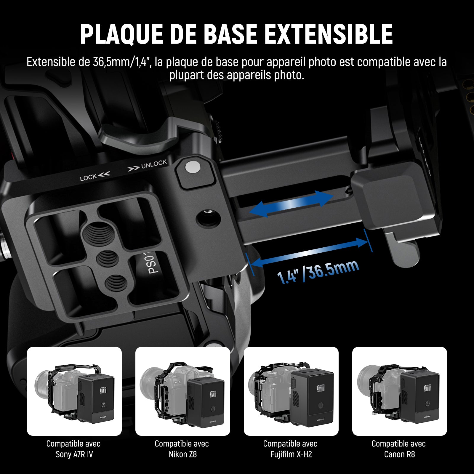 - 【Support de Caméra Extensible】 Réglable à 1,4"/36,5mm, la plaque de montage de l'appareil photo est compatible avec Canon R5C R100 EOS R50 Sony FX3 FX30 Alpha A9 A7S A7R A7CR A7C A6700 ZV-E10 Nikon Zf Zfc Z30 Z9 Fujifilm X100VI X-S20 X-T5 X-H2S Panasonic Lumix GH6 S5 IIX Blackmagic 4K 6K et d'autres appareils photo numériques DSLR/sans miroir