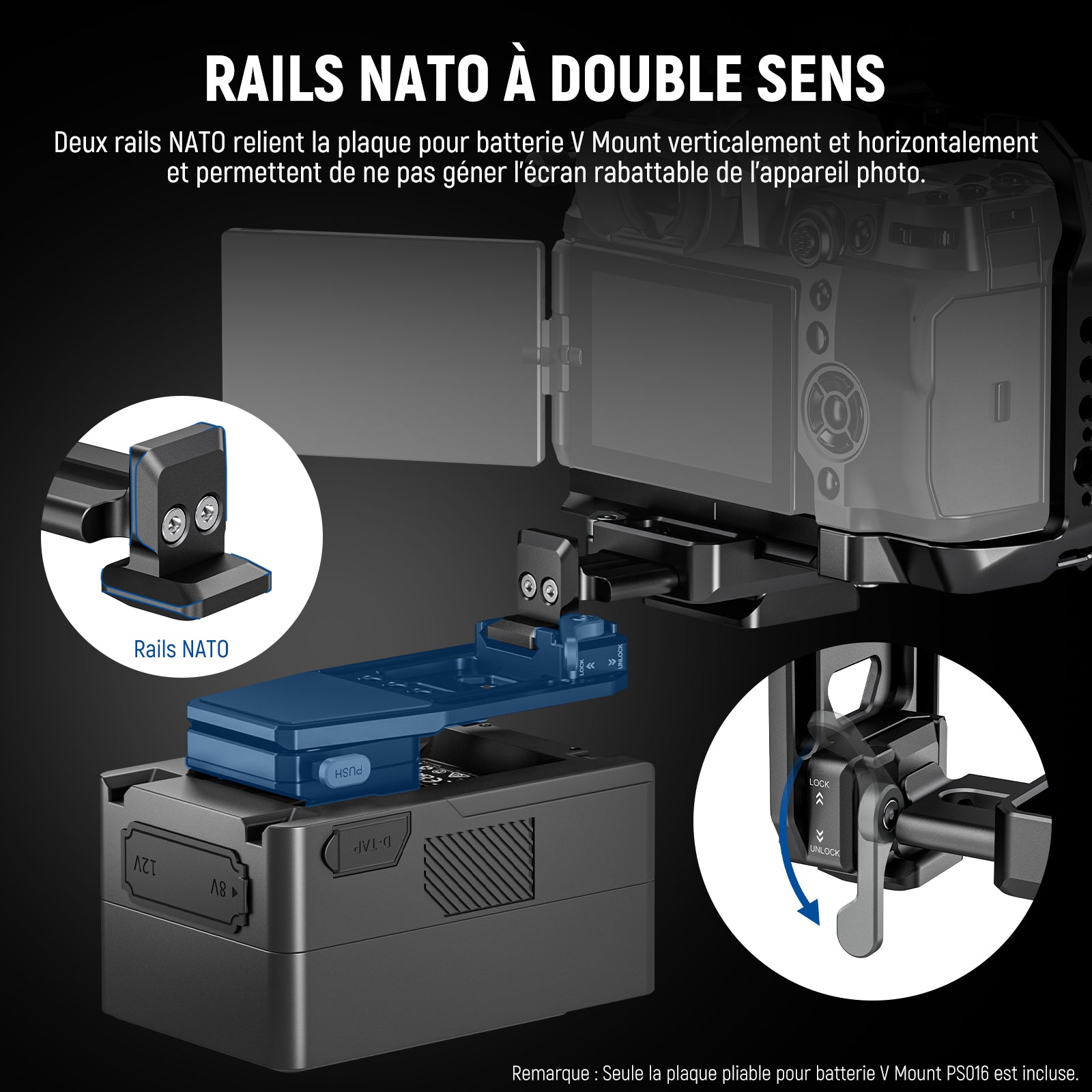 - 【Rails NATO dans Deux Directions】 Deux rails NATO connectent la plaque de batterie V mount dans les directions verticales et horizontales, et s'assurent que l'écran rabattable de la caméra sera entièrement articulé