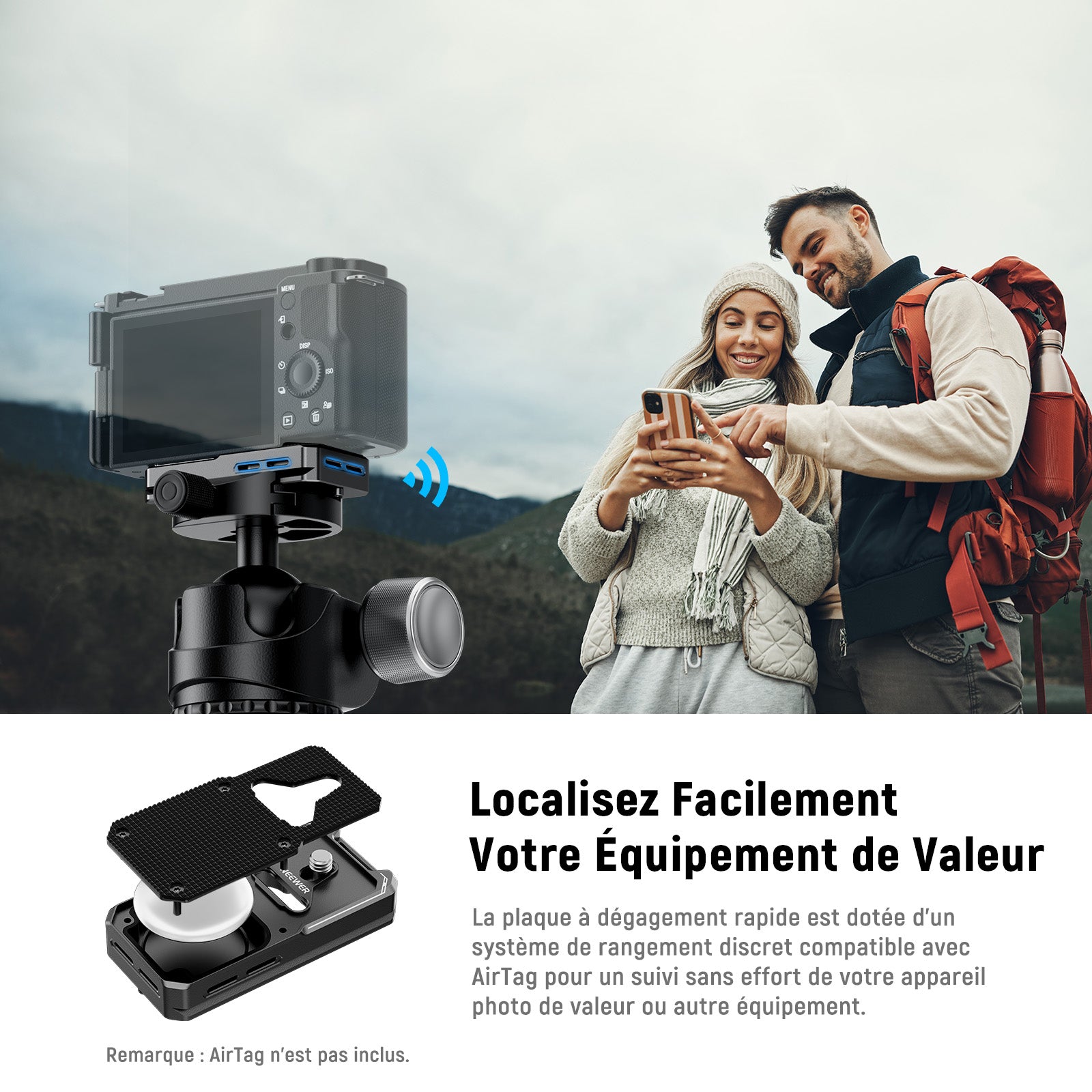 - Localisez facilement votre équipement coûteux : entièrement compatible avec Apple AirTag, la plaque à dégagement rapide dispose d'un design de rangement discret sur le dessus, permettant un suivi sans effort de vos précieux accessoires de photographie ou équipements tels que les appareils photo reflex numériques, aidant à prévenir les pertes et à améliorer la sécurité. Les ouvertures latérales assurent des signaux de suivi forts à tout moment. Remarque : AirTag n'est pas inclus ; il doit être acheté séparément pour le suivi