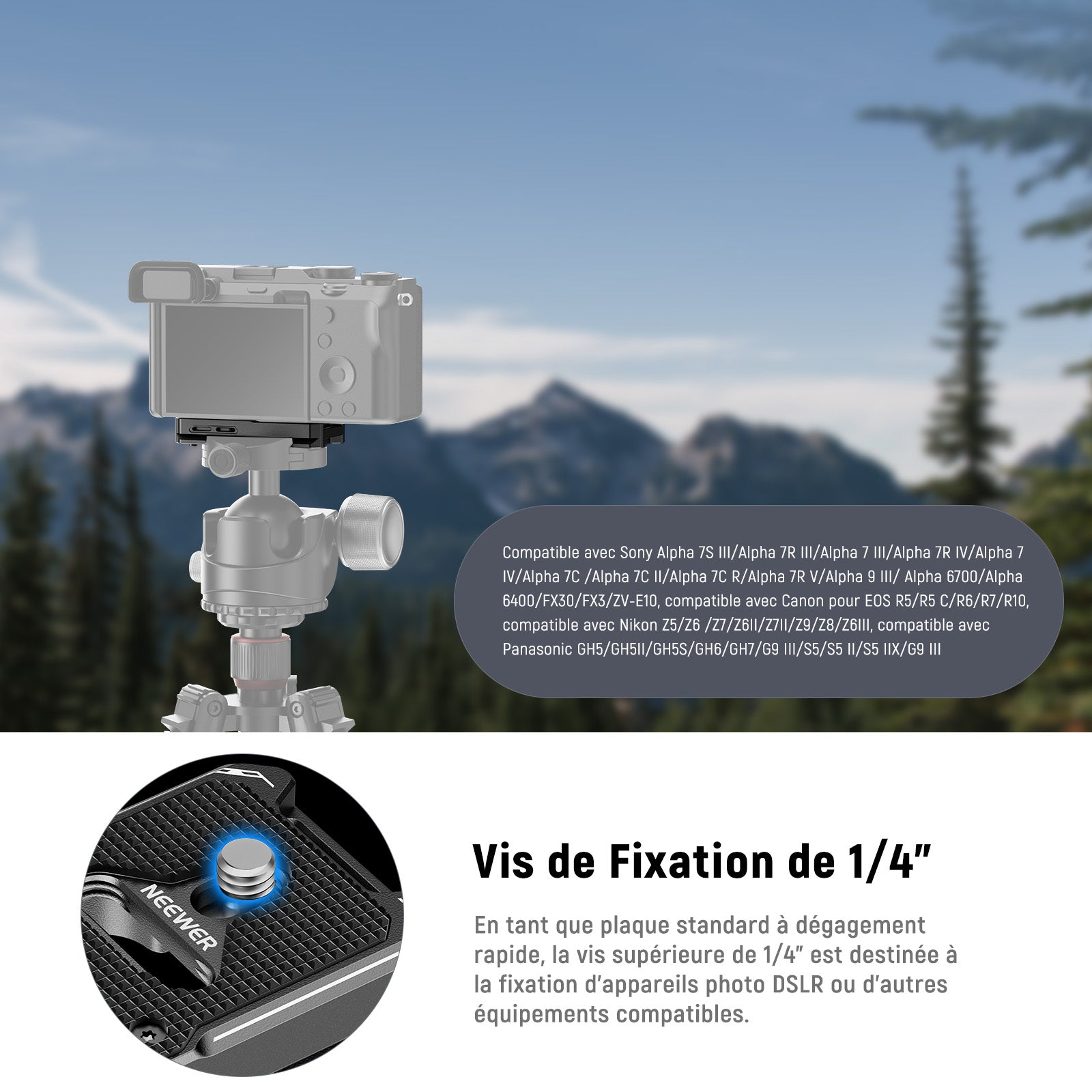 - Large compatibilité : la vis de montage supérieure de 6,35 mm est destinée à fixer des appareils photo reflex numériques ou d'autres accessoires ou équipements de valeur, compatible avec Sony Alpha 7S III/Alpha 7R III/Alpha 7R IV/Alpha 7 IV/Alpha 7C /Alpha 7C II/Alpha 7C R/Alpha 7R V/Alpha 9 III/Alpha 6700/A6400/FX30/FX30/FX30/FX33. /ZV-E11 0, compatible avec Canon pour EOS R5/R5 C/R6/R7/R10, compatible avec Nikon Z5/Z6/Z7/Z6II/Z7II/Z9/Z8/Z6III, compatible avec Panasonic GH5/GH5II/GH5S/GH6/GH7/G9 III/S5/S5 IIX/G9 III, Leica SL. 2