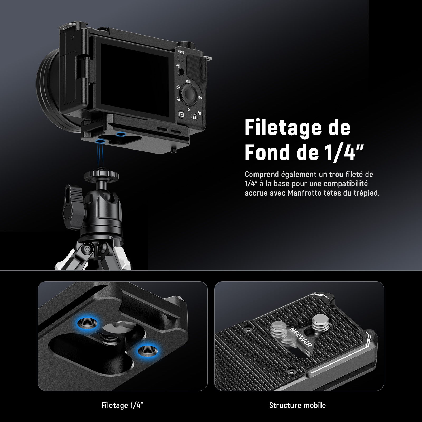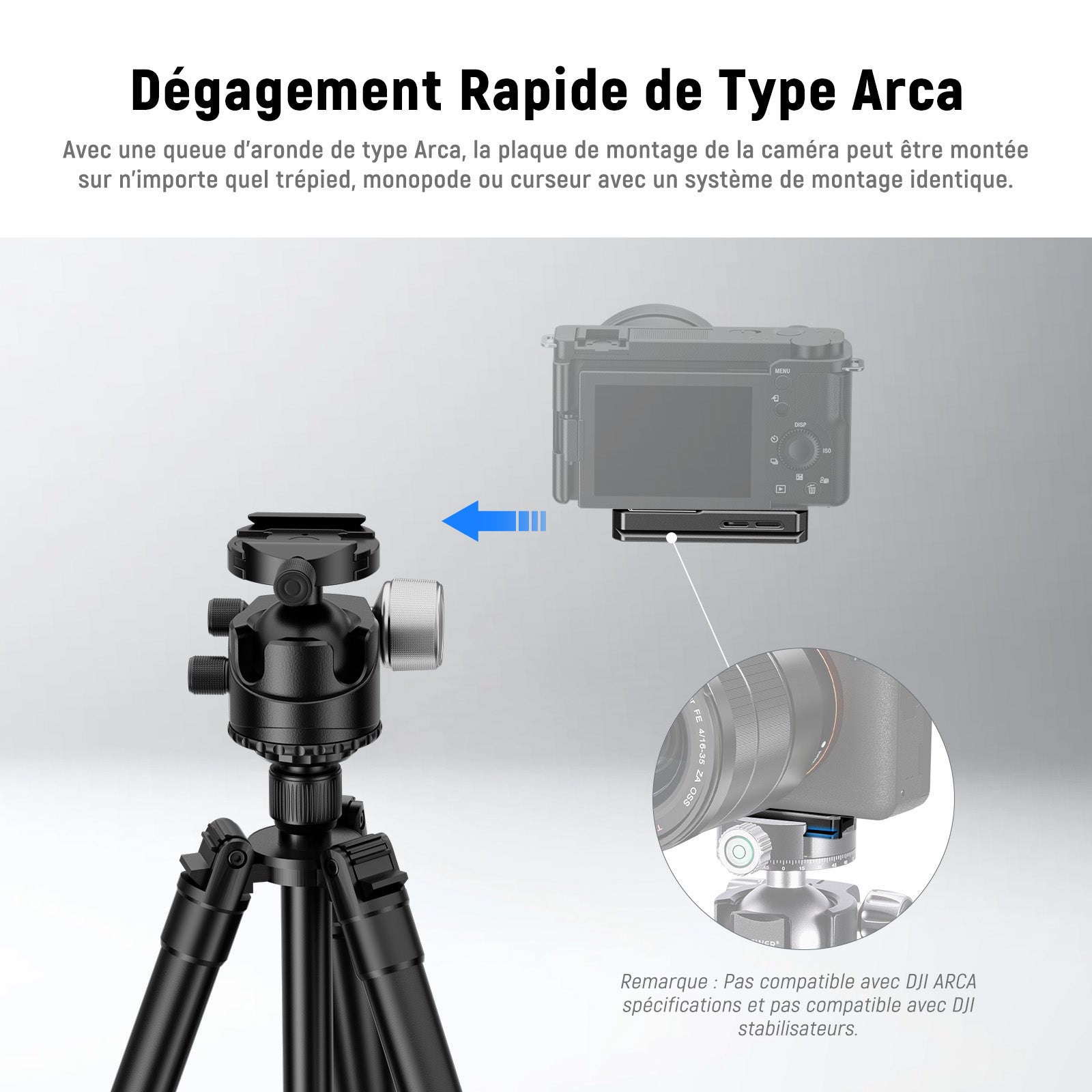 - 【Libération rapide de type Arca】Avec une queue d'aronde de type Arca, la plaque de montage de l'appareil photo peut être montée sur n'importe quel trépied, monopode ou curseur avec un système de montage identique à celui que doivent avoir le créateur de contenu et l'influenceur. Comprend également un trou fileté de 6,35 mm sur le fond pour plus de compatibilité avec les têtes de trépied Manfrotto. Remarque : non compatible avec les spécifications DJI ARCA et non compatible avec les stabilisateurs DJI