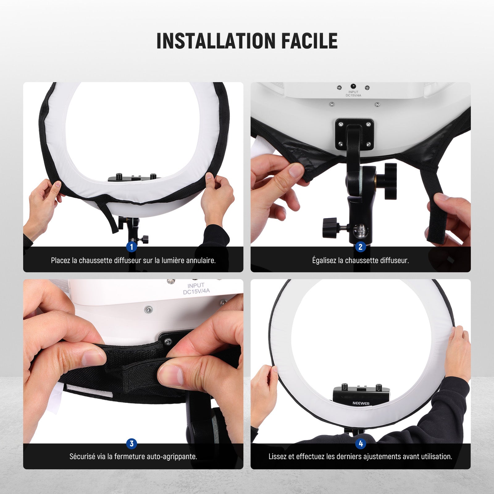 - 【Installation sans effort】 Les bandes élastiques du diffuseur peuvent facilement couvrir l'anneau lumineux RP18B Pro. La fermeture auto-agrippante aide à sécuriser ce diffuseur ajusté et à éviter les fuites de lumière