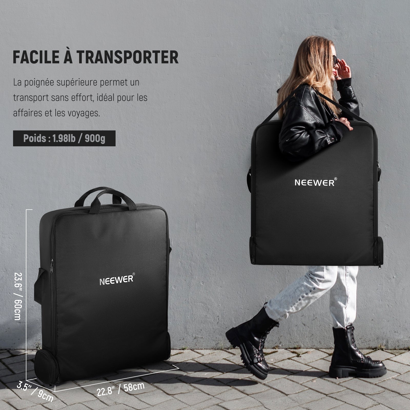 • Sac de transport pour anneau lumineux de 45,7 cm avec support :  mesurant 60 x 58 cm, ce sac de rangement peut accueillir des anneaux lumineux jusqu'à 45,7 cm de diamètre, ainsi que d'autres accessoires tels que des têtes sphériques, des batteries, des adaptateurs, des câbles, des filtres, même des trépieds, pour les garder en sécurité et bien organisés lors de vos déplacements. Les fermetures éclair bidirectionnelles facilitent l'ouverture et la fermeture du sac