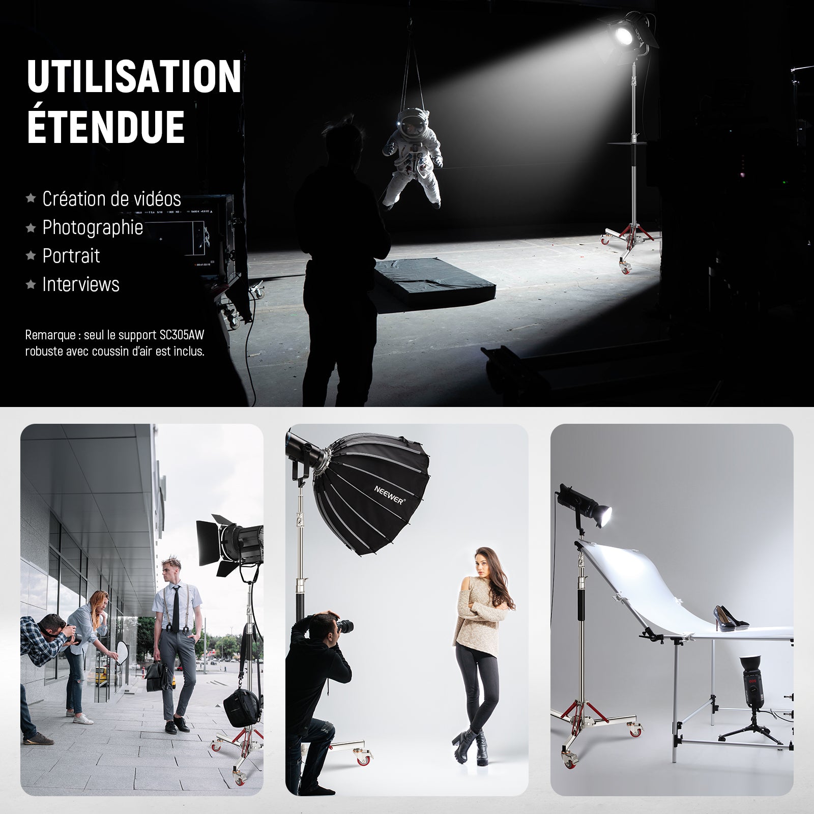 - Grande Compatibilité- Le goujon 5/8" universel est compatible avec NEEWER flash de studio Q4 400W 2,4G TTL, les stroboscopes, les monolampes, les ring lights, les éclairages vidéo LED CB60 RGB, MS60B, RGB1200, les réflecteurs, les softbox, les parapluies pour appareil photo, etc.. Ce support roulant est idéal pour les différentes situations de prise de vue.