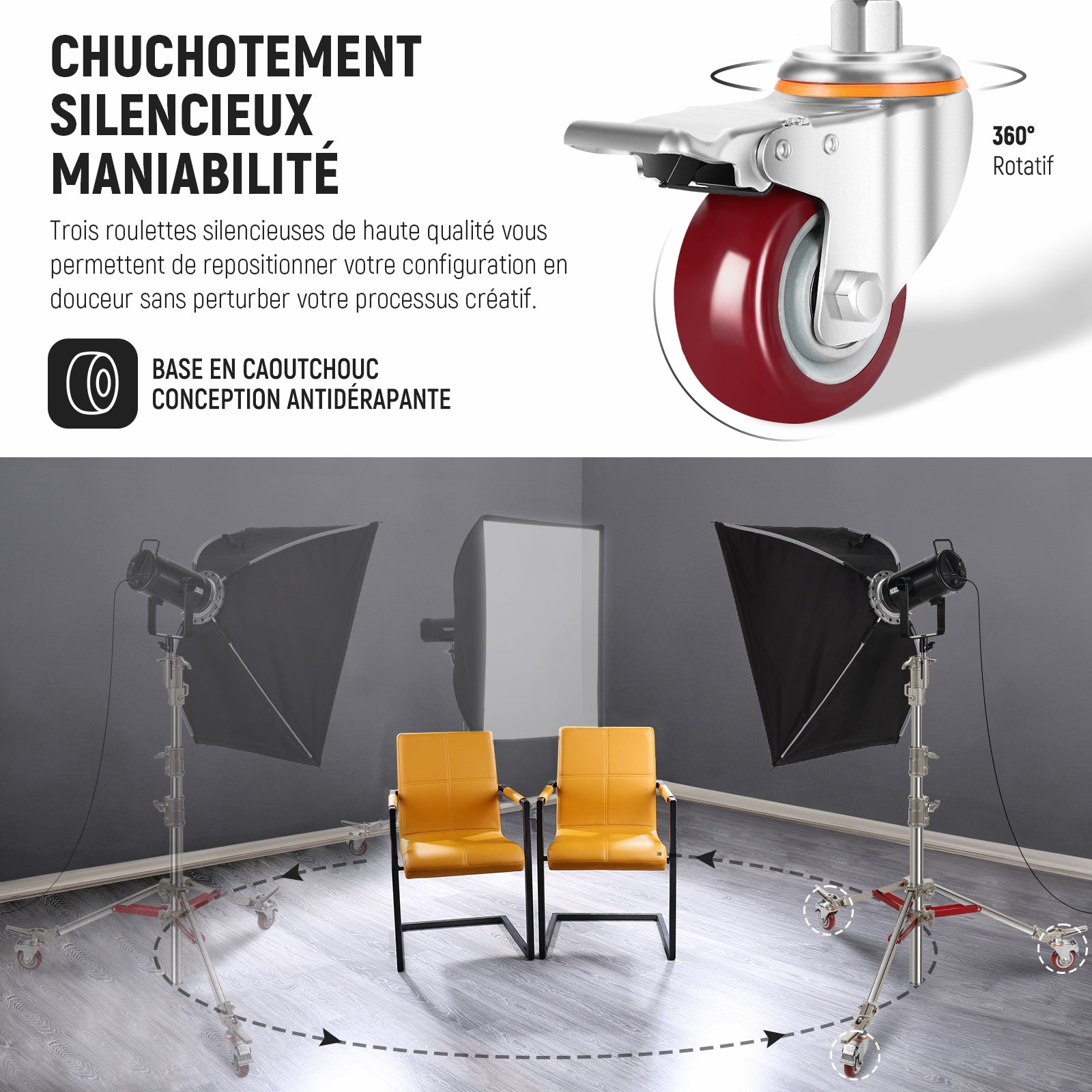 - 【Trépied avec roulettes à 360°】 Équipé de roulettes pivotantes à 360° pour une mobilité pratique et améliorée, ce trépied roulant vous permet de faire glisser votre équipement lourd sur le sol sans le traîner ni le soulever. Les freins à pédale verrouillent les roulettes et maintiennent le support immobile pendant son utilisation. Les roues en caoutchouc protègent le sol des rayures