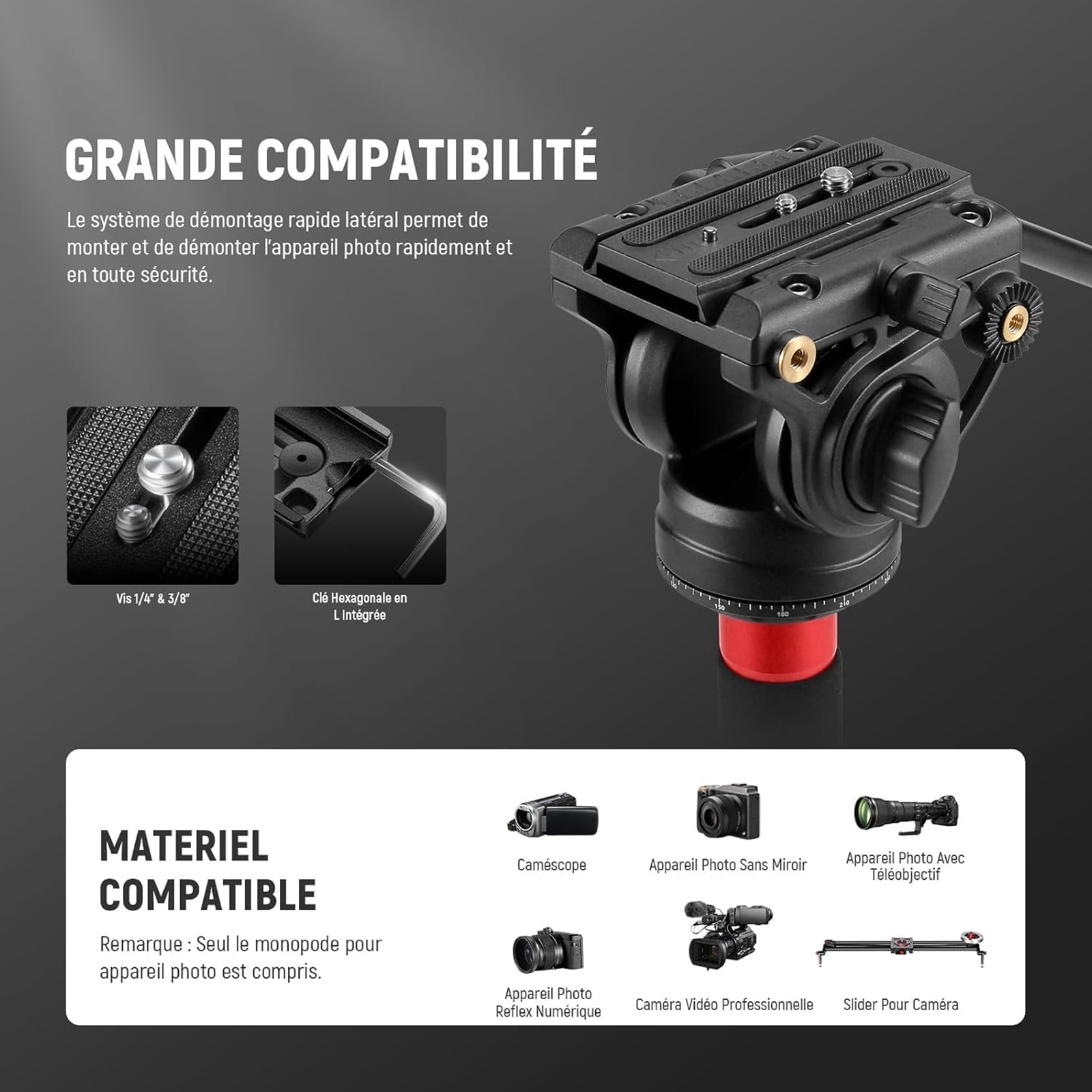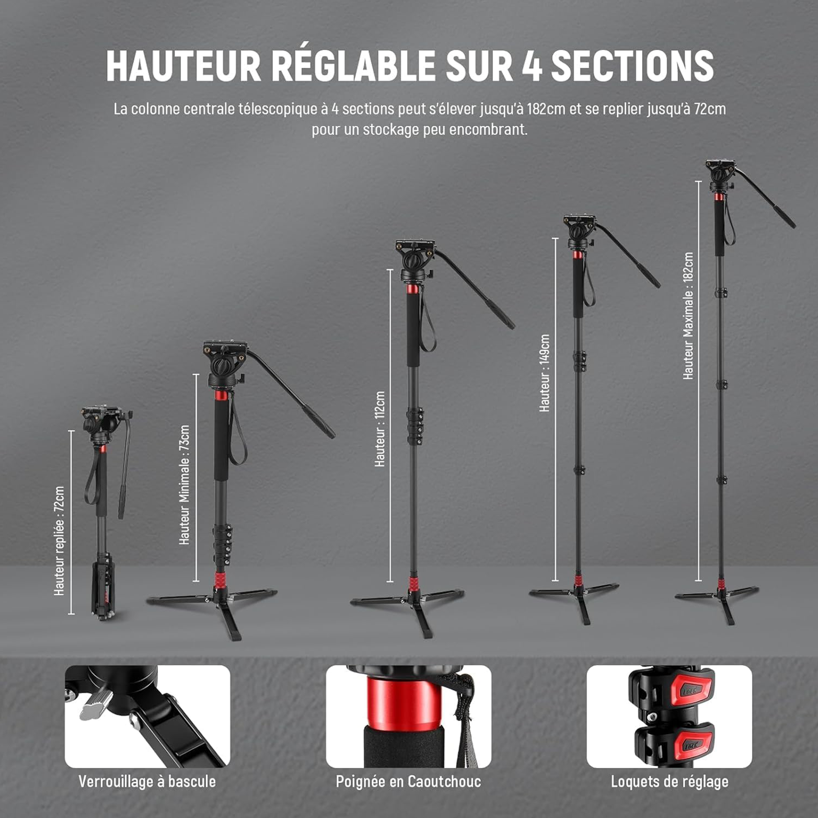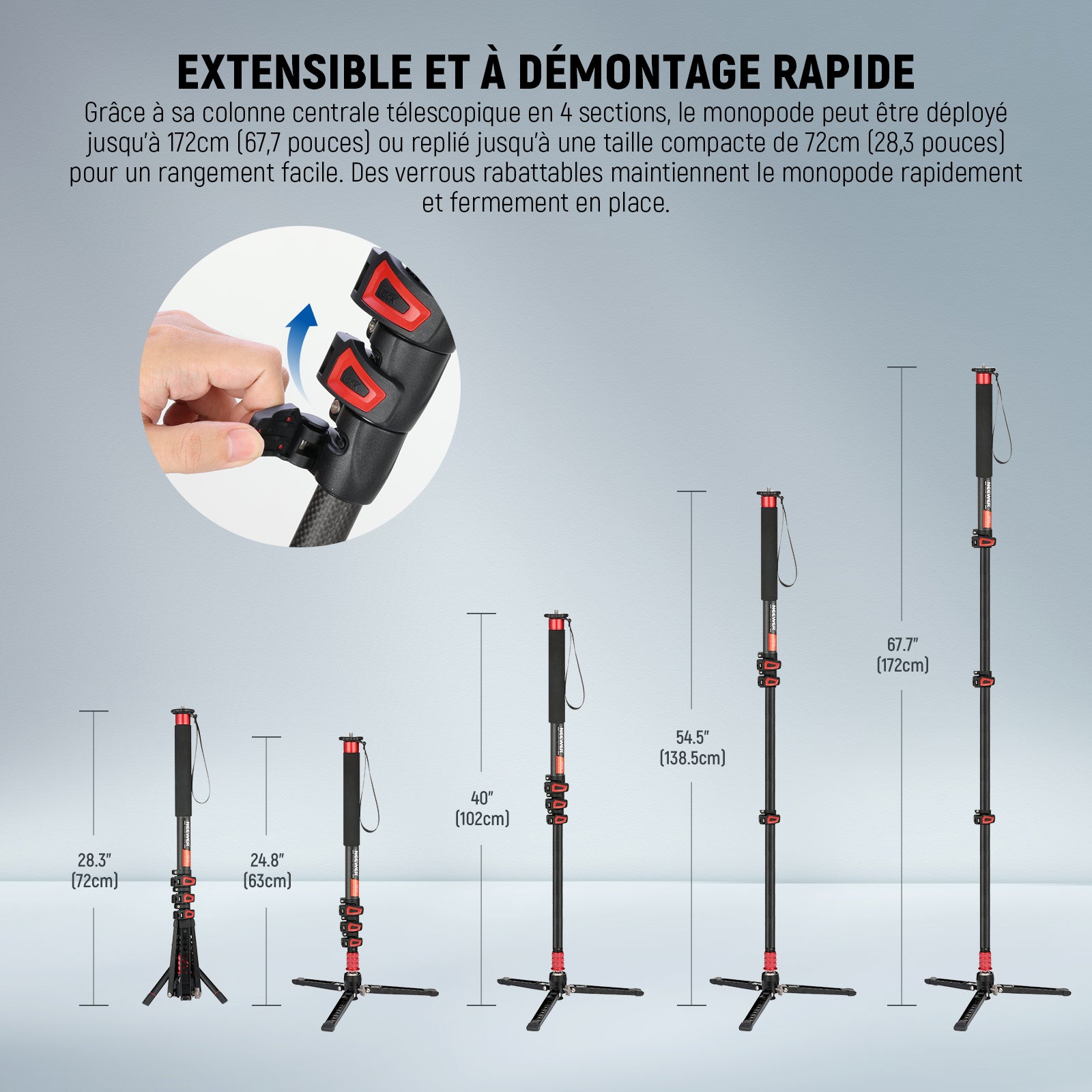 - Extensible et à libération rapide : avec une colonne centrale télescopique à 4 sections, le monopode peut être étendu jusqu'à 172cm ou plié à une taille compacte de 72cm pour un rangement facile. Les verrous à rabat maintiennent le monopode rapidement en place