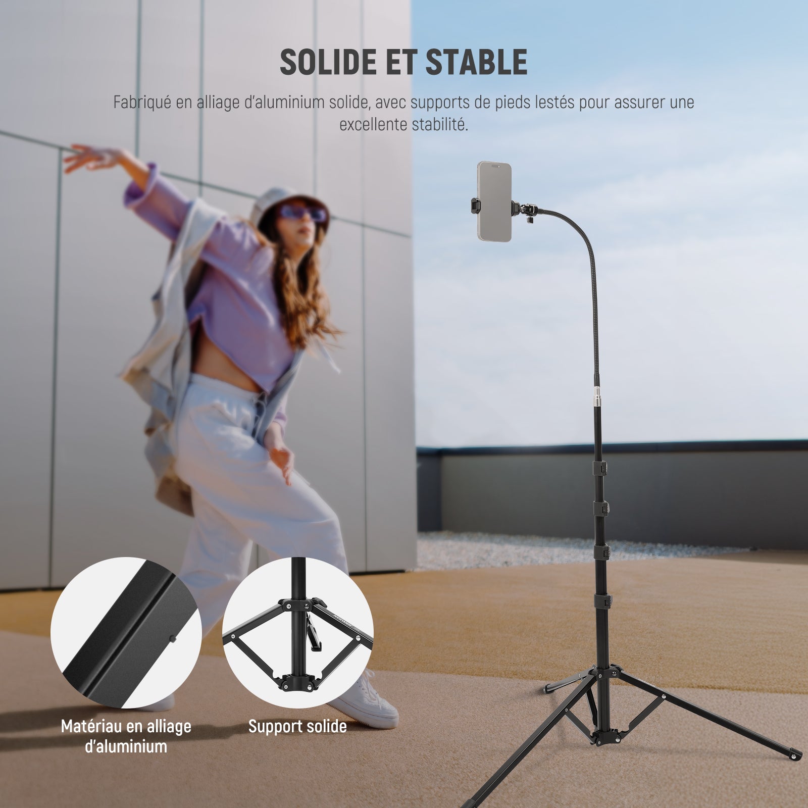 - 【Support de trépied de téléphone stable et flexible】 Améliorez votre expérience de photographie sur smartphone avec ce kit de trépied pour téléphone portable.Fabriqué en alliage d'aluminium robuste,le trépied de photographie assure une stabilité avec ses supports de jambe lestés. Le bras flexible et la rotule inclus permettent des angles flexibles et un réglage en douceur,le support de téléphone maintient solidement votre appareil et contrôle l'obturateur de l'appareil photo avec la télécommande