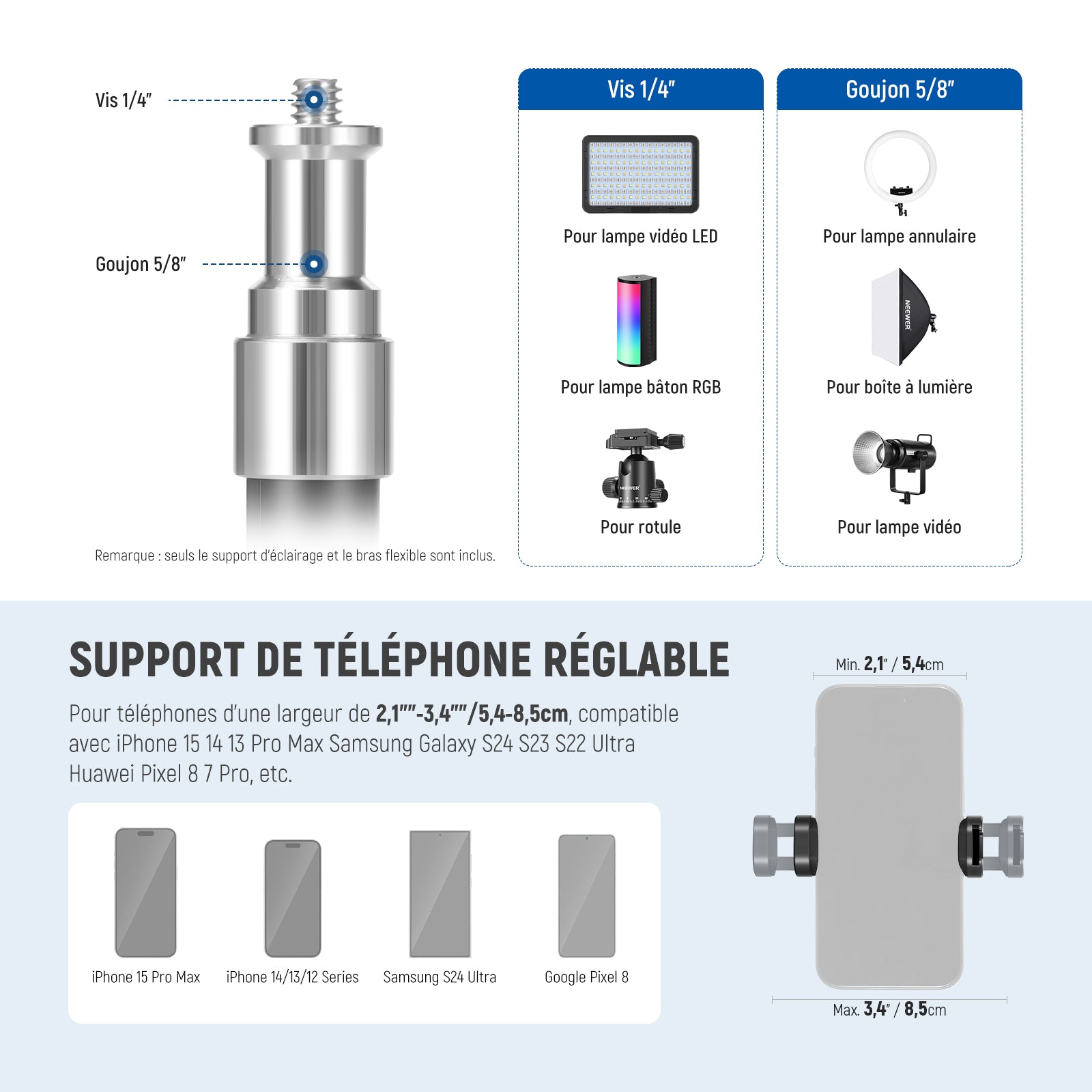- 【Support de téléphone universel】 Le support de téléphone réglable de 5,4 à 8,5cm est compatible avec iPhone 16 15 14 13 Pro Max Samsung Galaxy S24 S23 S22 Ultra Huawei Pixel 8 7 Pro et autres smartphones pour la prise de vue verticale et horizontale, avec une griffe froide pour les lumières de remplissage ou les microphones pour construire votre plate-forme de photographie. Les coussinets antidérapants protègent votre téléphone des rayures