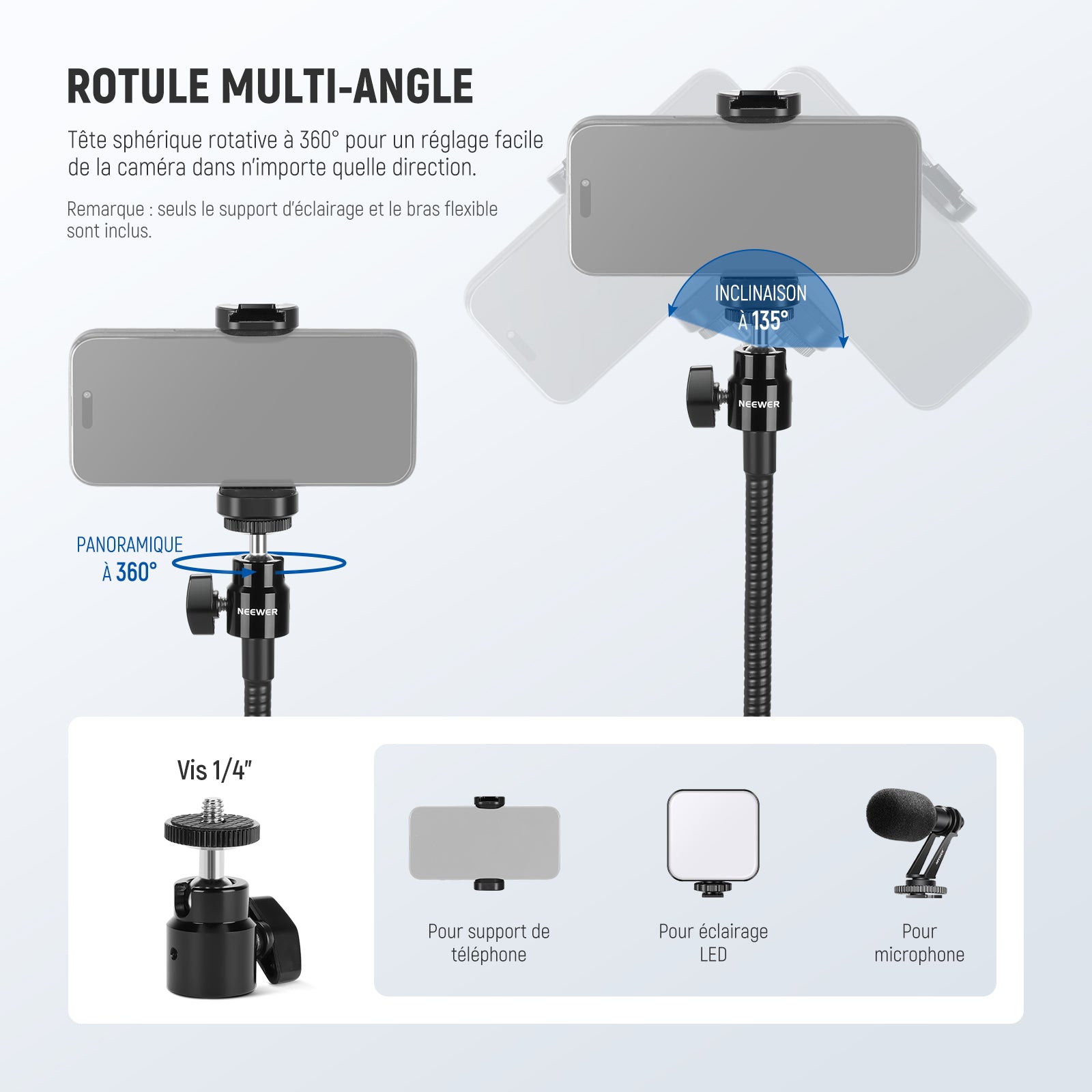 - 【Tête sphérique à 360° et bras flexible】 Le bras flexible de 45cm présente un niveau d'adaptabilité remarquable qui conserve sa forme même lorsqu'il est plié, garantissant que votre téléphone reste en toute sécurité à n'importe quel angle ou hauteur souhaité. La rotule permet une rotation et une inclinaison fluides à 360°, et peut être montée en haut du bras pour des perspectives plus uniques