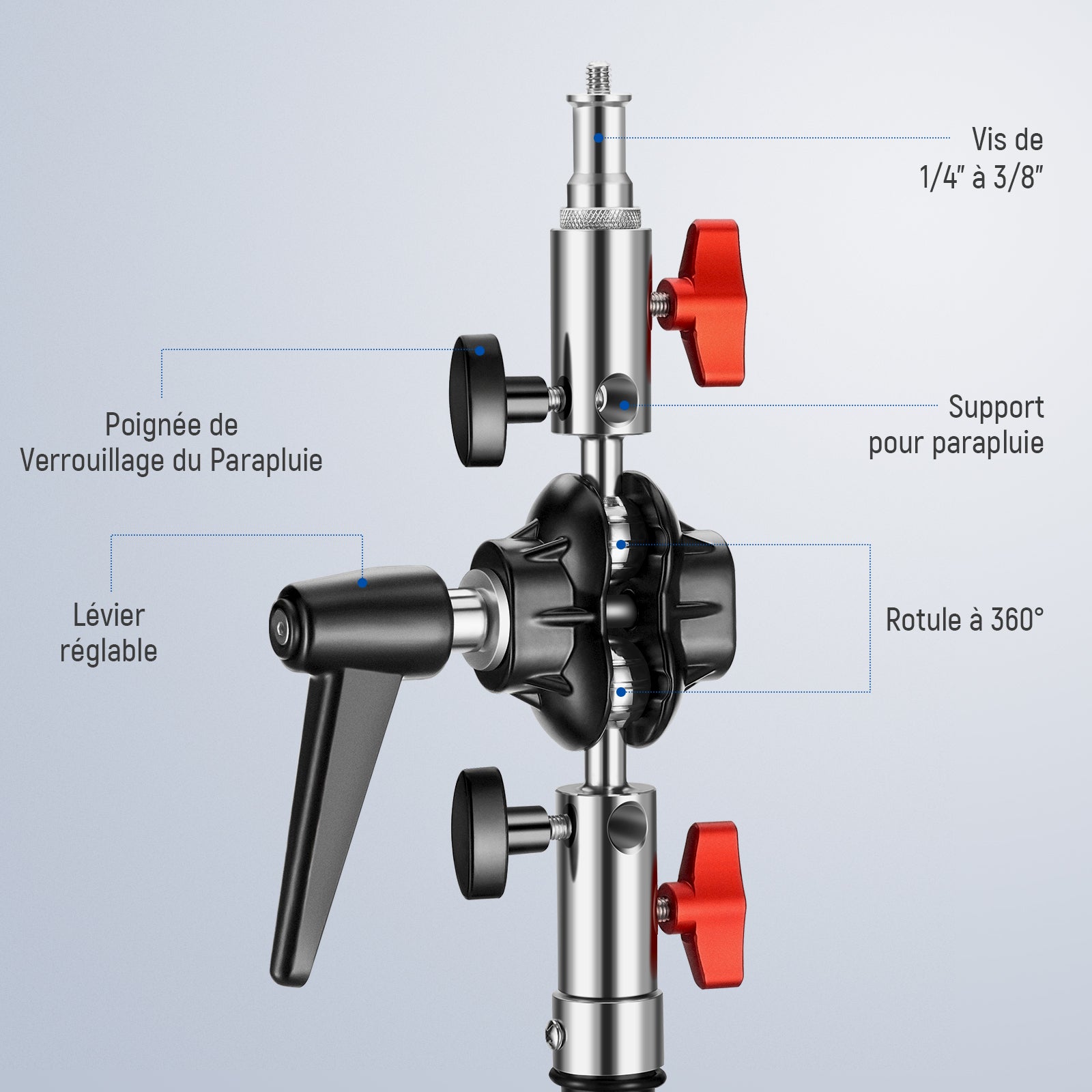 • 【Embout Femelle réglable de 5/8"】 L'ensemble est montable sur un pied d'éclairage de studio, un pied de type C-stand ou d'autres accessoires équipés d'un embout 5/8. Veuillez noter que le trépied est utilisé à titre d'illustration et nécessite un achat séparé.