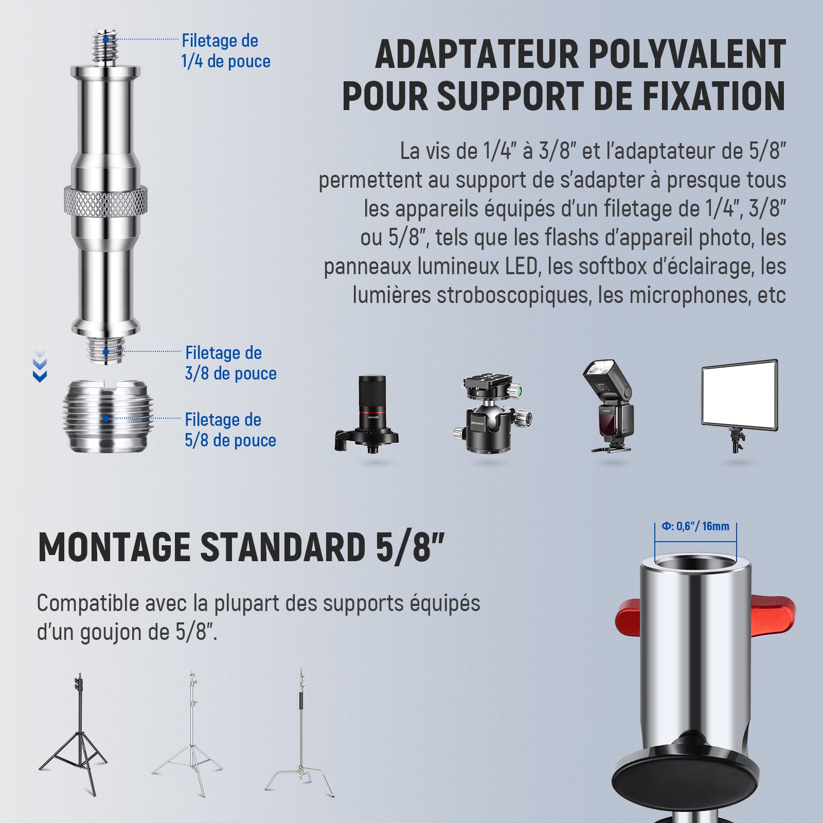 • 【Plusieurs points de fixation 】 Cet adaptateur est doté de vis filetées mâles de 1/4" et 3/8". L'adaptateur peut être monté sur une fixation de 5/8" utilisée pour le montage de lumières annulaires, de flashs speedlite, de lumières stroboscopiques, de lumières vidéo LED, de softboxes, de microphones, et bien plus encore. Un adaptateur de vis de 3/8" à 5/8" est inclus pour ajouter des équipements supplémentaires.