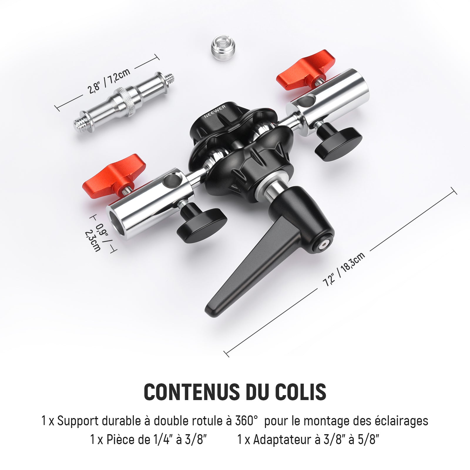 • 【Double rotule pour un positionnement flexible et polyvalent】L'ensemble est conçu avec deux rotules fixées par un boulon réglable ainsi que des supports permettent un pivotement à 180°. Une telle configuration est bien adaptée aux prises de vue en contre-plongée et en plongée. Vous pouvez également régler l'angle grâce au levier métallique ergonomique et verrouiller solidement l'adaptateur de montage en place, même en présence d'un écran de moniteur ou d'une lumière de studio installée.