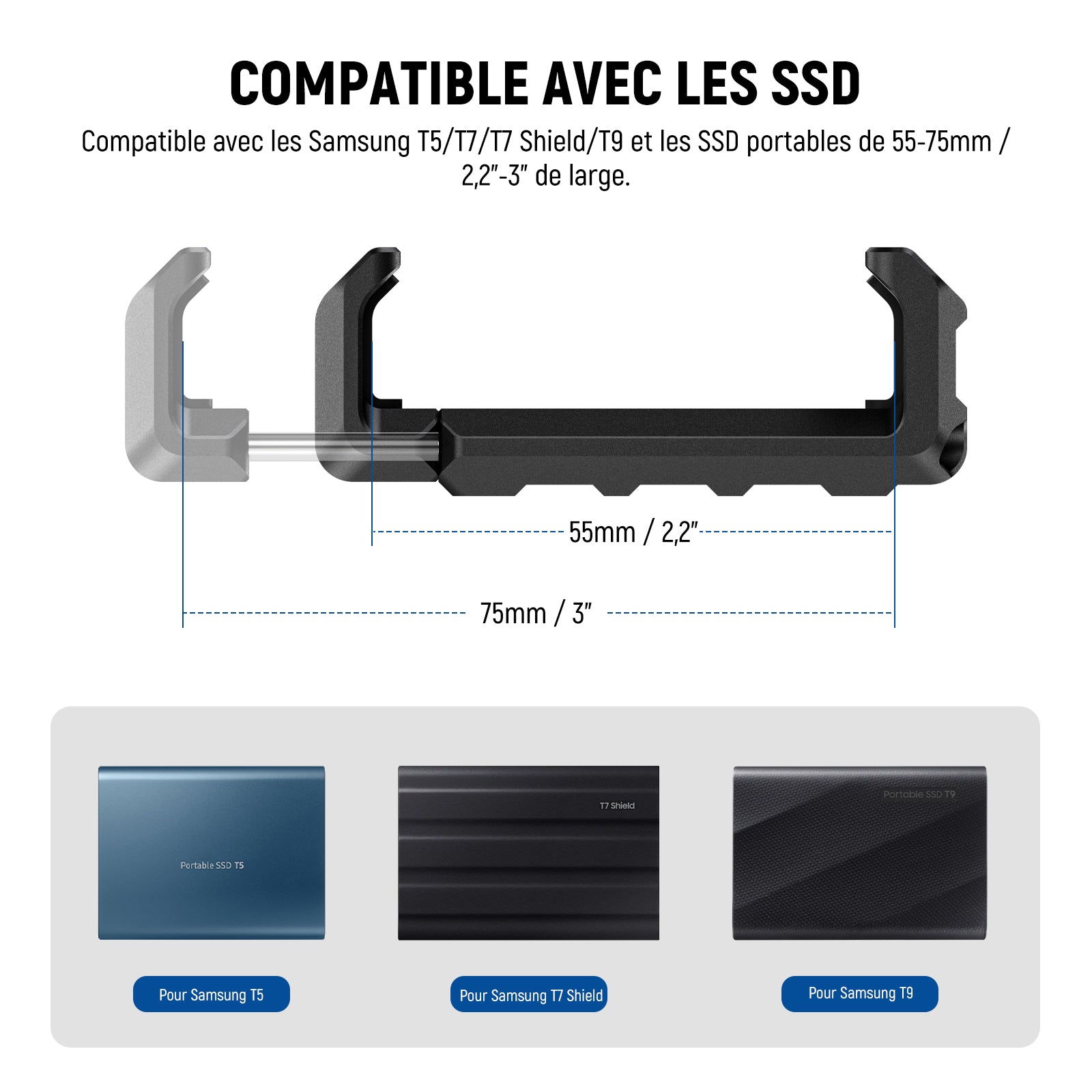• 【Support de montage SSD portable pour T5/T7/T9 】 Ce support de montage SSD dispose d'une pince à ressort réglable de 2,2"-3"/55-75mm et est compatible avec le SSD portable Samsung T5/T7/T7 Shield/T9. Un support pour griffe froide sur un côté peut également connecter une lampe vidéo LED compacte ou un mini microphone pour une qualité vidéo améliorée