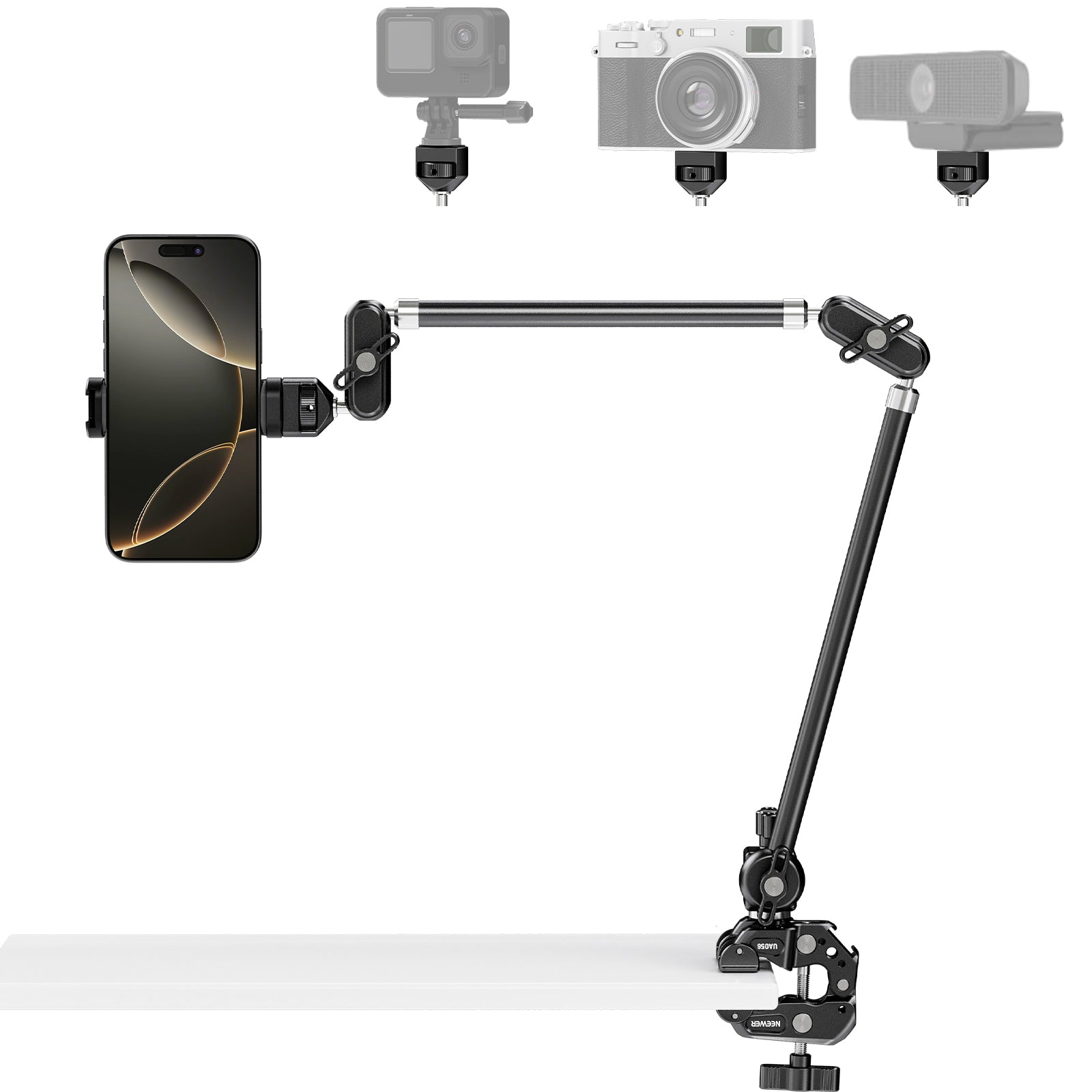 - 【Stabilité et flexibilité améliorées】 Amélioré avec conception de connexion d'engrenage,bras magique articulé en métal super clamp monte de manière stable une caméra ou une webcam (charge maximale 1kg) au-dessus de tête à l'aide de super pince inférieure,augmentée à 3 points de pivot pour plus de stabilité sur plateaux de table.Structure à rotule multiple permet un positionnement flexible et conception intégrée garantit utilisation immédiate dès sortie de boîte.Support de téléphone est inclus