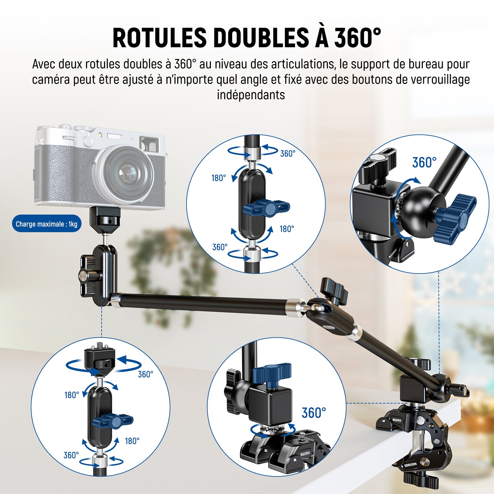 - 【Têtes à rotule doubles à 360°et portée étendue de 75cm】Avec un bras articulé à deux sections de 75cm et des têtes à rotule doubles à 360°aux articulations,support de bureau pour caméra peut être ajusté à n'importe quel angle et fixé avec des boutons de verrouillage indépendants,idéal pour prise de vue aérienne,vlogging,diffusion en direct,enregistrement vidéo YouTube,vidéoconférence,appels Zoom,etc.Remarque:super pince et bras magique sont attachés et ne peuvent pas être utilisés séparément