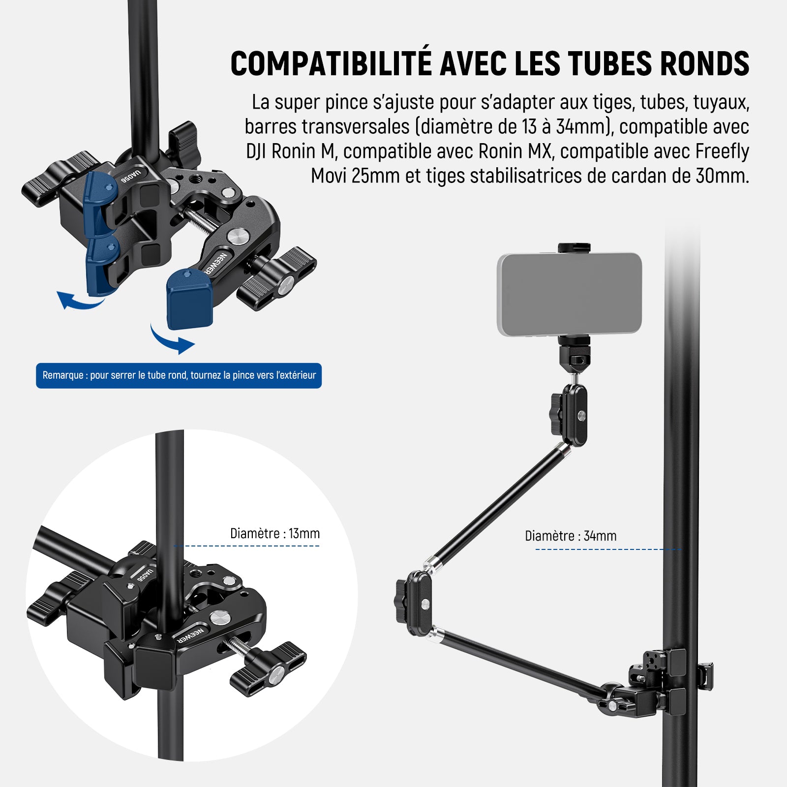 - Compatibilité : tige/poteau/table/moniteur/DSLR