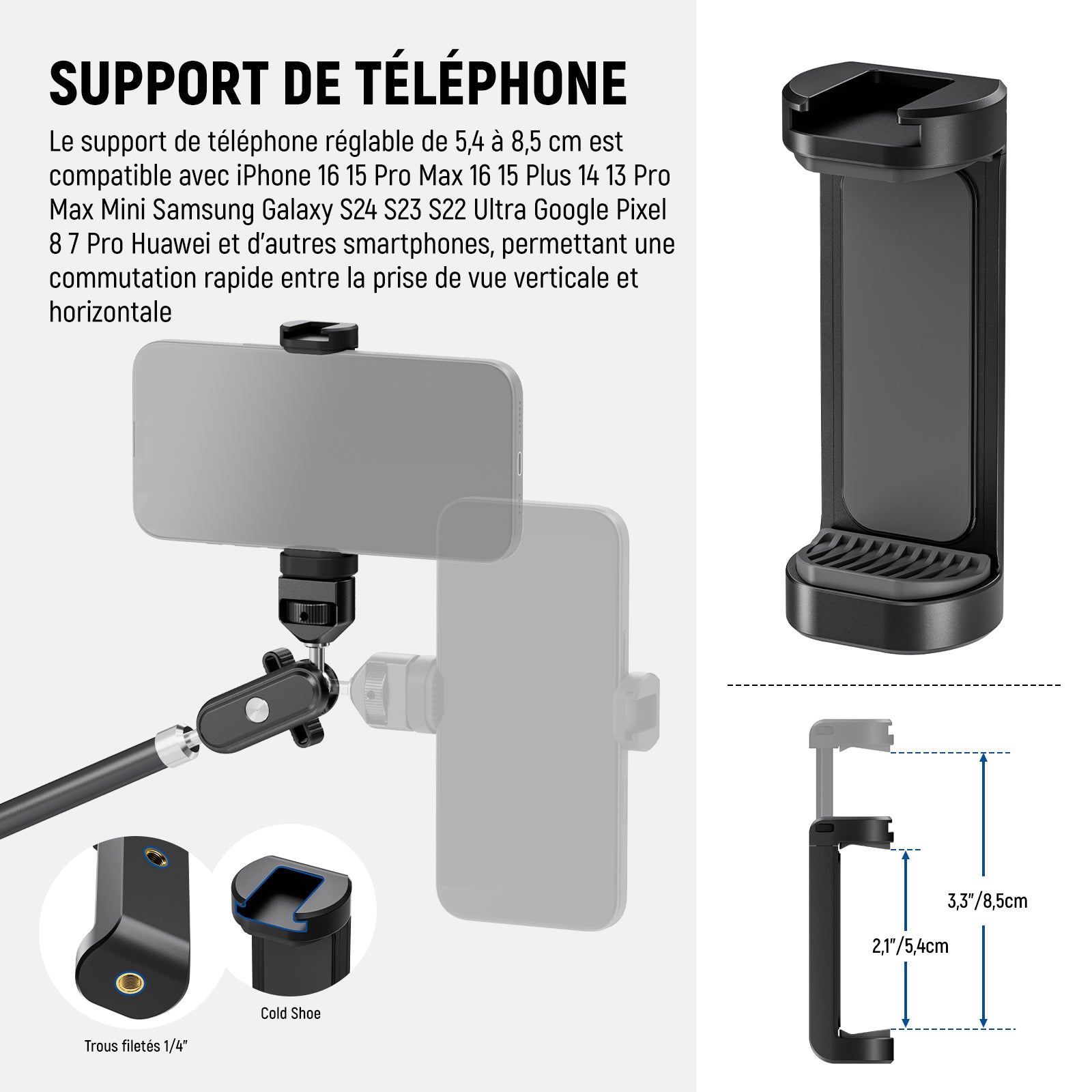 - 【Support de téléphone inclus】 Le support de téléphone réglable de 2,1"-3,3"/5,4-8,5cm est compatible avec iPhone 16 15 14 13 Pro Max Samsung Galaxy S24 S23 S22 Ultra Huawei Pixel 8 7 Pro et d'autres smartphones, permettant une commutation rapide de la prise de vue verticale et horizontale