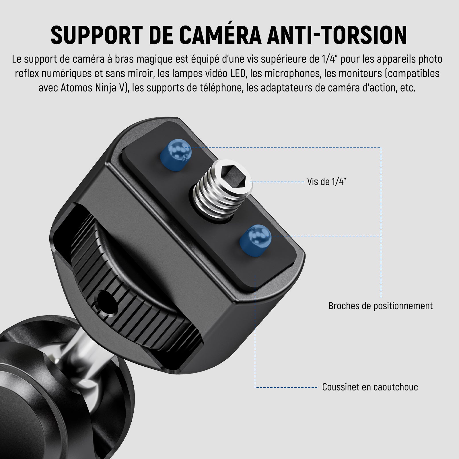 - 【Montage de caméra anti-torsion】 Le support de caméra à bras magique est équipé d'une vis supérieure de 1/4" pour les appareils photo reflex numériques et sans miroir, les lampes vidéo LED, les microphones, les moniteurs (compatibles avec Atomos Ninja V), les supports de téléphone, les adaptateurs de caméra d'action, etc. Les broches anti-torsion et les coussinets en caoutchouc antidérapants empêchent les oscillations ou les vibrations pendant l'utilisation