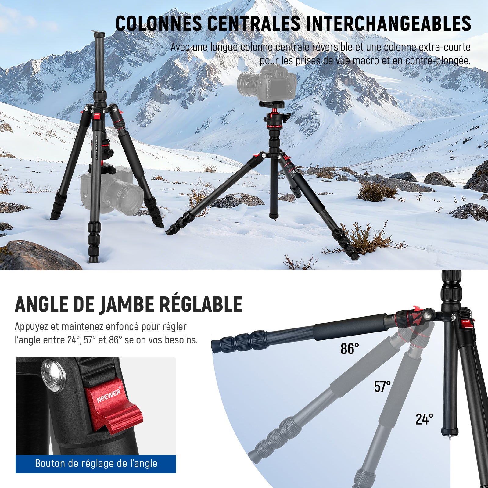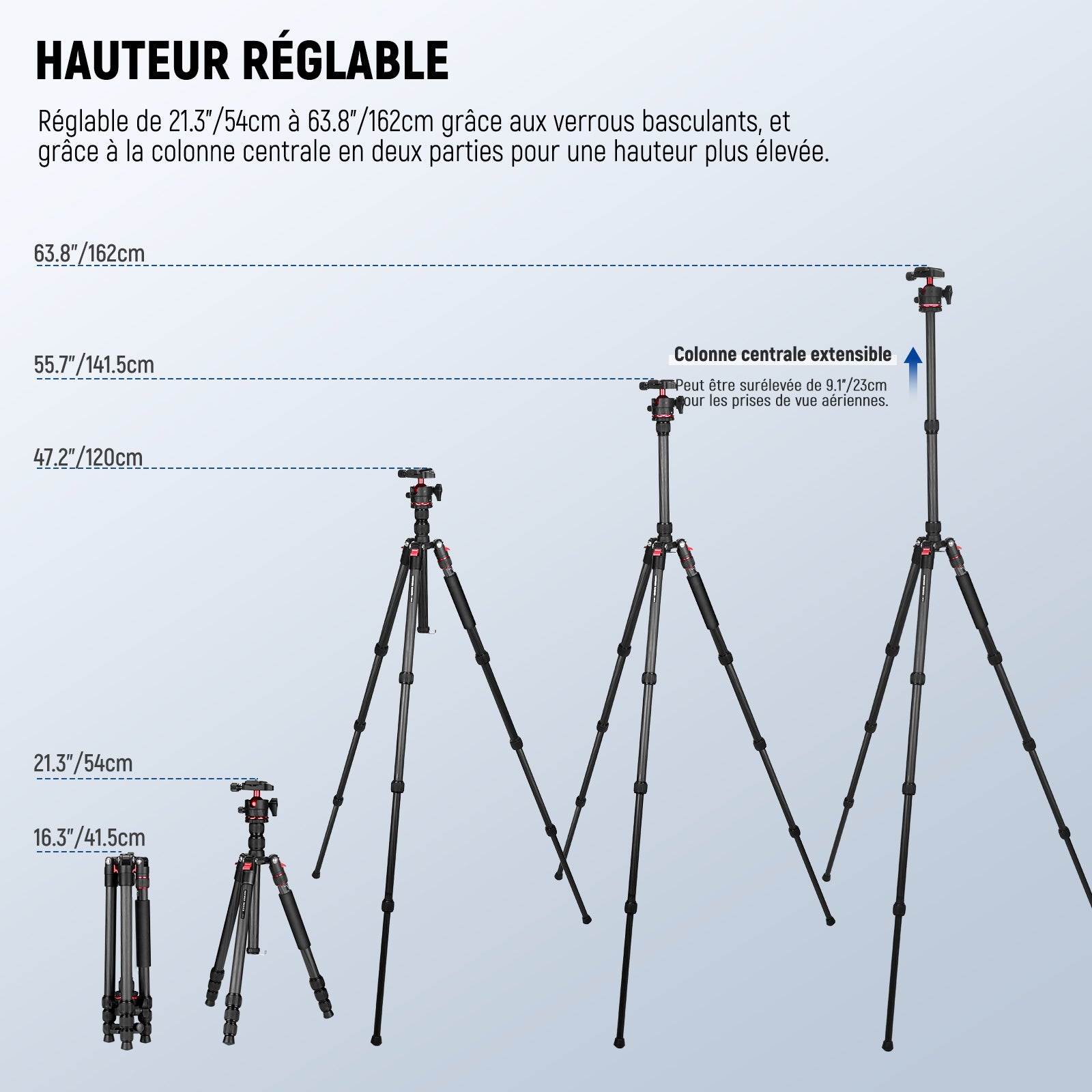 - 【Réglage rapide et facile】 Ce trépied haut s'ajuste de 54cm à 120cm, avec une colonne en deux sections extensible jusqu'à 162cm ou inversable pour les prises de vue macro. Appuyez pour choisir parmi trois angles de jambe.