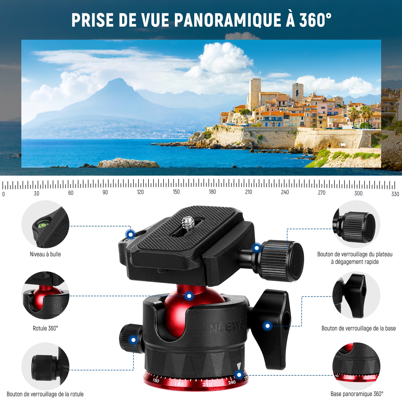 - 【Rotule 360° et plaque de fixation rapide Arca】 Ce support pour trépied permet une rotation à 360° et une inclinaison à 90°. Il est également équipé d'une plaque de fixation rapide Arca de 1/4‘’ compatible avec Sony Canon Nikon appareils photo hybrides, ainsi que d'autres équipements photo et accessoires de vlogging.