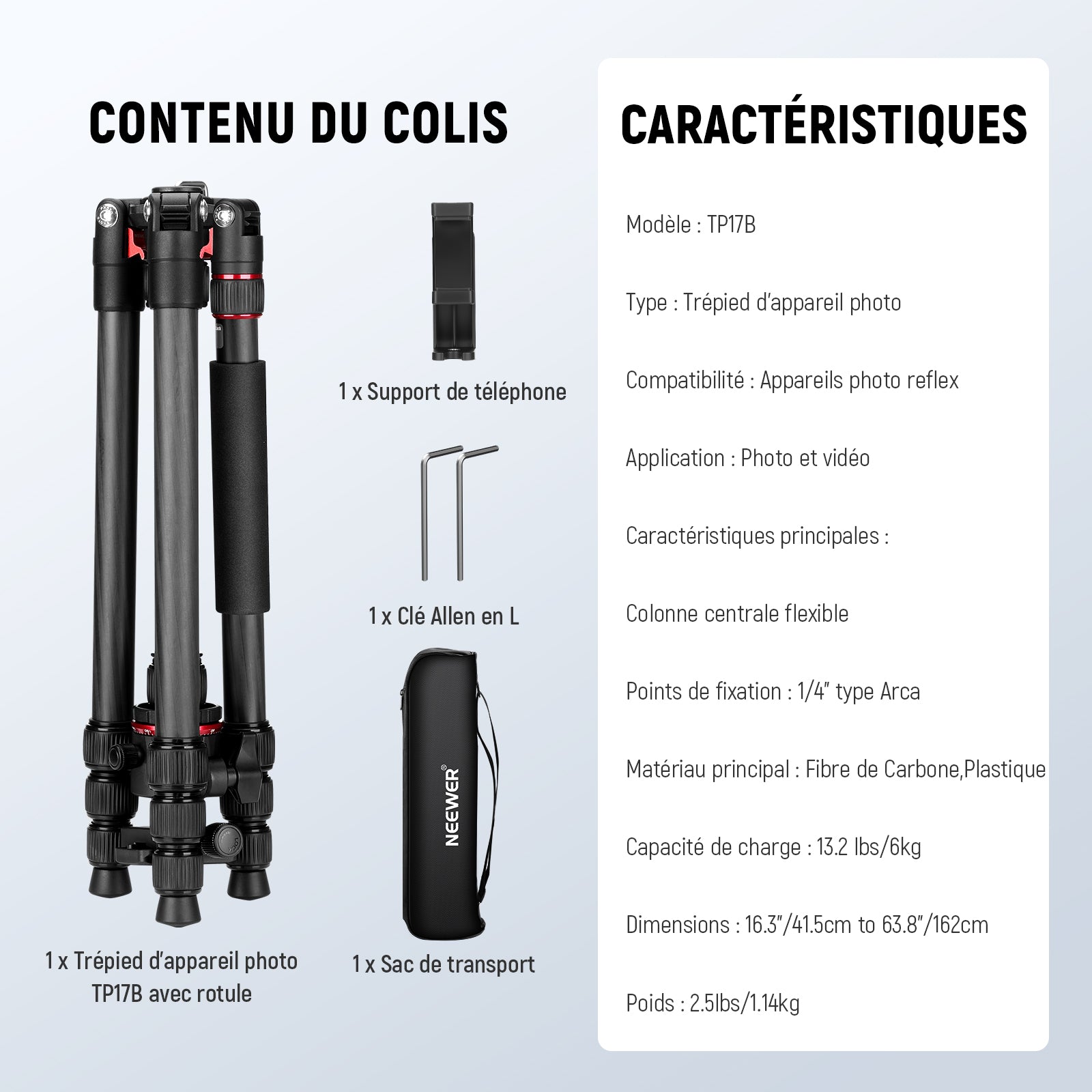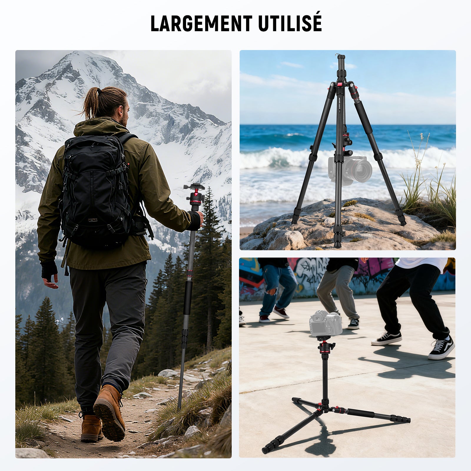 - 【Trépied de voyage en fibre de carbone】 Ce trépied professionnel robuste supporte les appareils photo reflex numériques jusqu'à 6kg. Il est équipé d'un crochet de lestage et de pieds en caoutchouc pour une meilleure stabilité. Les pieds réversibles se replient jusqu'à 41,5cm et se transforment facilement en monopode pour vos déplacements.
