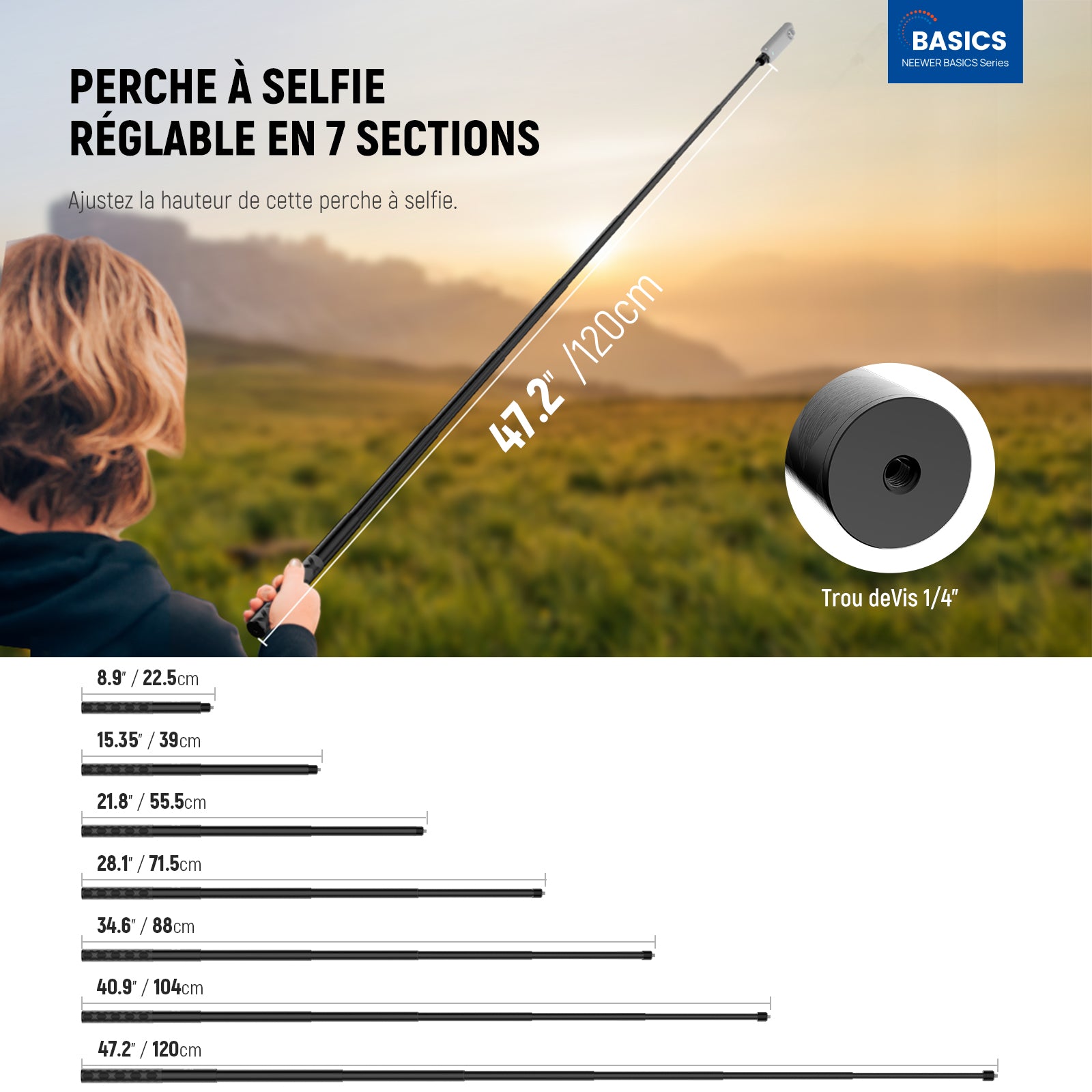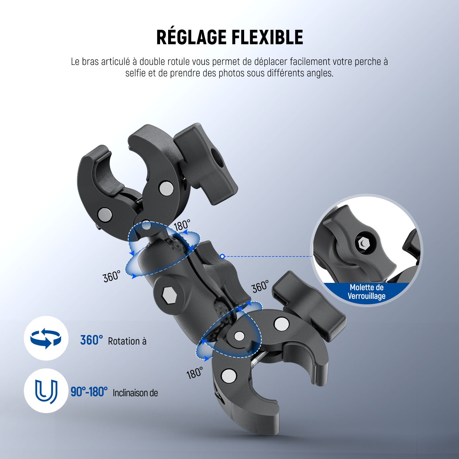 - Réglable et flexible : la poignée de la perche à selfie s'ajuste de 22,5 cm (8,9") à 120 cm (47,2") de longueur. En outre, le bras magique comprend deux rotules à 360° pour des angles flexibles, un équipement photographique indispensable pour les créateurs de contenu et les influenceurs