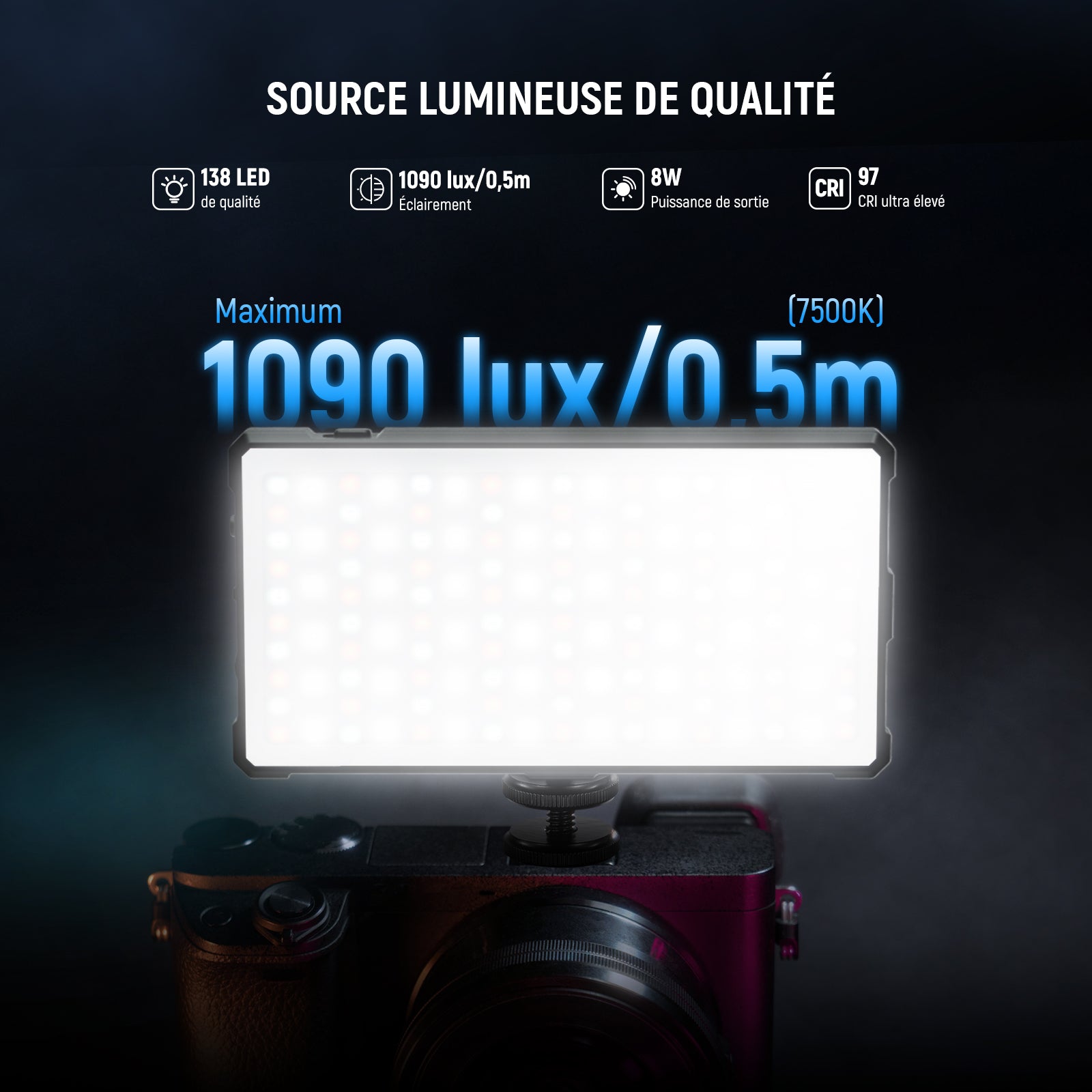 - 【Éclairage couleur pour caméra avec CCT/HSI/FX】Doté de 45 LED chaudes, 45 LED froides et 48 LED RVB combinées,cet éclairage délivre jusqu'à 984lux/0,5m avec 3 modes d'éclairage: CCT/HSI/FX. En mode CCT, la température de couleur s'étend de 2700K à 7500K et la luminosité est réglable en continu de 0 à 100%. Le mode HSI offre un spectre complet de couleurs avec une sélection horizontale à 360° pour des tons riches et personnalisables, tandis que le mode FX propose 17 effets de scène dynamiques.