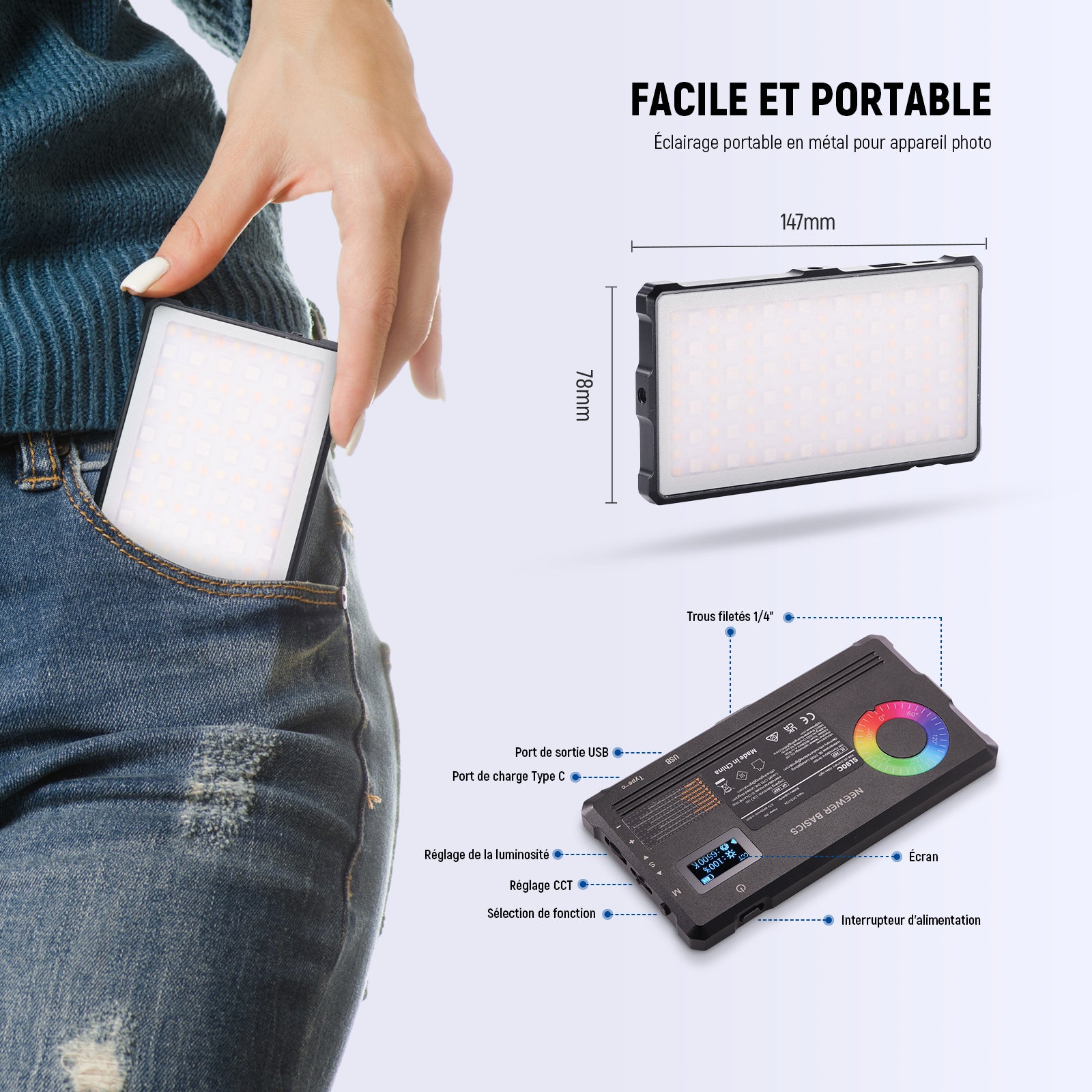 - 【Lampe de poche en métal portable pour les déplacements】la lampe de studio SL90C est composée d'un alliage d'aluminium léger mais robuste et est une lampe à selfie LED RVB portable conçue pour une utilisation flexible dans une variété de scénarios d'éclairage dans la photographie et la vidéographie. Avec des dimensions de seulement 15 x 8 x 1,2cm et un poids de seulement 235g, il se glisse facilement dans votre sac et se transporte facilement.