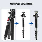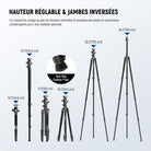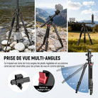 - Réglage de la hauteur fluide et sécurisé : doté de pieds pliables en 5 sections, ce trépied de voyage robuste pour téléphone et appareil photo s'étend jusqu'à 164 cm et peut être ajusté sans effort et verrouillé en toute sécurité à l'aide de verrous à rabat. Ses réglages flexibles en hauteur et en angle permettent des compositions polyvalentes pour des prises de vue créatives. Détachez facilement un pied pour convertir le trépied en un monopode pour la photographie et la vidéographie
